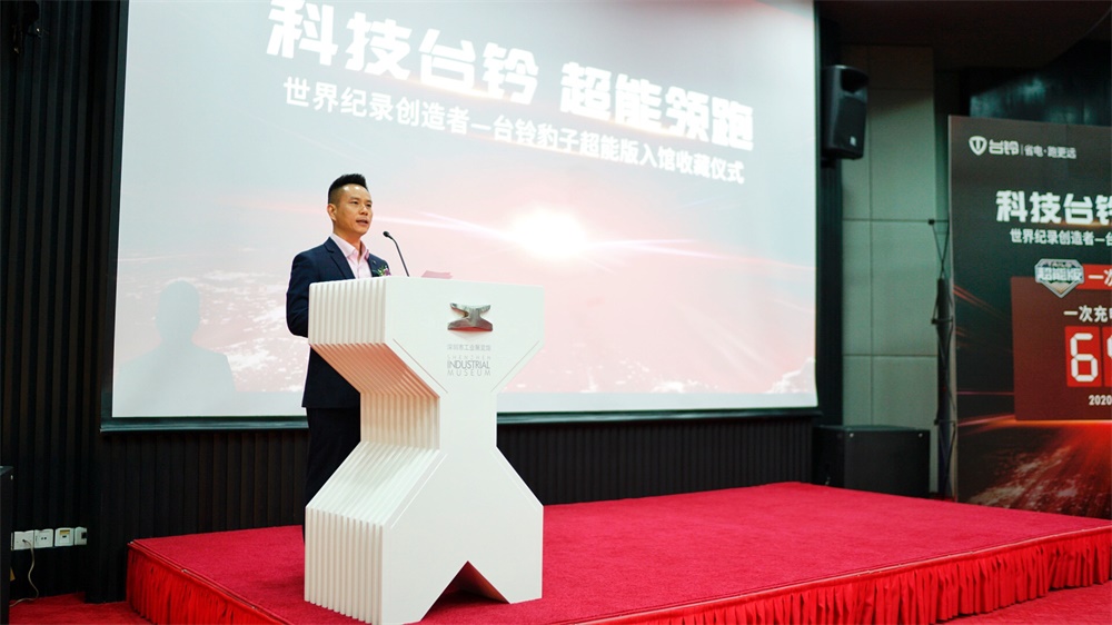 深圳市工業(yè)展覽館副館長(zhǎng)潘文峰,深圳電動(dòng)車(chē)產(chǎn)業(yè)促進(jìn)委員會(huì)執(zhí)行會(huì)長(zhǎng)楊華,臺(tái)鈴集團(tuán)董事長(zhǎng)孫木鉗、臺(tái)鈴集團(tuán)總裁助理兼公關(guān)總監(jiān)胡東文等嘉賓齊聚深圳市工業(yè)展覽館,參加了以“科技臺(tái)鈴超能領(lǐng)跑”為主題的世界紀(jì)錄創(chuàng)造者——臺(tái)鈴豹子超能版入館收藏儀式,共同見(jiàn)證了這一榮光時(shí)刻。