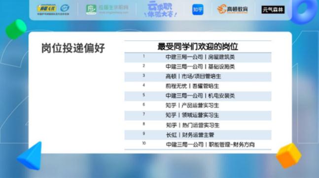這一點(diǎn)在本次大賽中,也得到了很好的證明,10家企業(yè)提供的54個(gè)崗位中,投遞量最高的10個(gè)職位分別來(lái)自中建三局一公司、知乎,另外高頓及前程無(wú)憂(yōu)的管培生分別排在第三、第四,不難發(fā)現(xiàn),國(guó)企、管培、互聯(lián)網(wǎng)對(duì)當(dāng)代大學(xué)生來(lái)說(shuō),更具備吸引力~