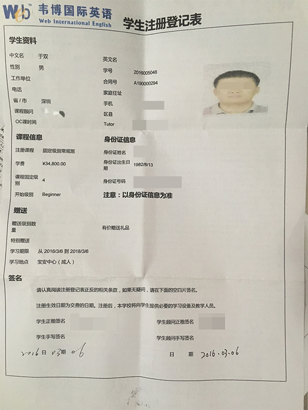 本人與韋博英語深圳寶安中心(位于海雅繽紛城)在2016年3月6日,簽訂《學(xué)生入學(xué)注冊合同》,總計學(xué)費34800元,我已經(jīng)超過1年時間,但只上了六節(jié)課。詢問退款之事,回復(fù)只可轉(zhuǎn)讓,再找人,就拖延時間。