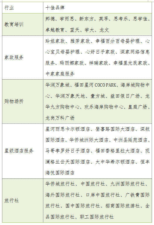 教育培訓方面20個課外培訓機構品牌的凈推薦值得分均為正值,整體平均得分為13.7,邦德教育以19.9的高分榮登教育培訓行業(yè)榜單首位;家政服務行業(yè)20家調查企業(yè)平均分值為12.8,玲姐家政以高于平均值7.4分,排名家政行業(yè)第一位;購物場所方面選取20家購物中心,20家購物中心得分同樣為正值,整體平均分為19.8,華潤萬象城以28.5的高分獲得購物中心排行榜桂冠,福田星河coco park以0.1分的劣勢排在榜單第二位;星級酒店服務方面,平均凈推薦值達到30.8分,高于同期發(fā)布其他四個行業(yè),排名第一的是星河麗思卡爾頓酒店,凈推薦值為37.0分;旅行社方面,排名第一的旅行社為華僑城旅行社評分29.8分,但20家旅行社之間評分差異較大,凈推薦值僅為12.0分,低于同期發(fā)布的其他行業(yè)。