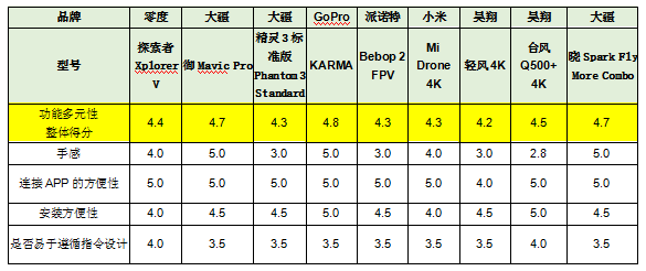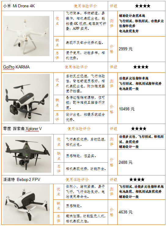 總評:小米“Mi Drone 4K”輔助設計表現最好,獲評4.5分。派諾特“Bebop 2 FPV”和零度“探索者Xplorer V”表現較差,僅獲評1.3分和1.8分。詳見下表。