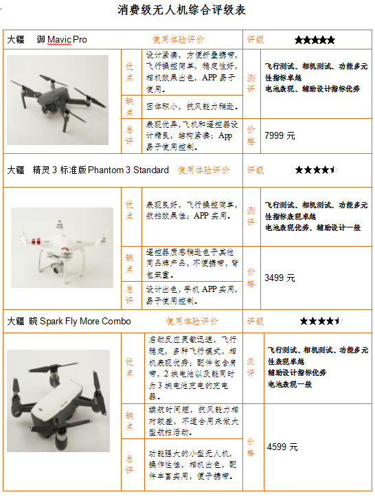 其中大疆的“御Mavic Pro”和“曉Spark Fly More Combo”表現出眾,獲得5分滿分。