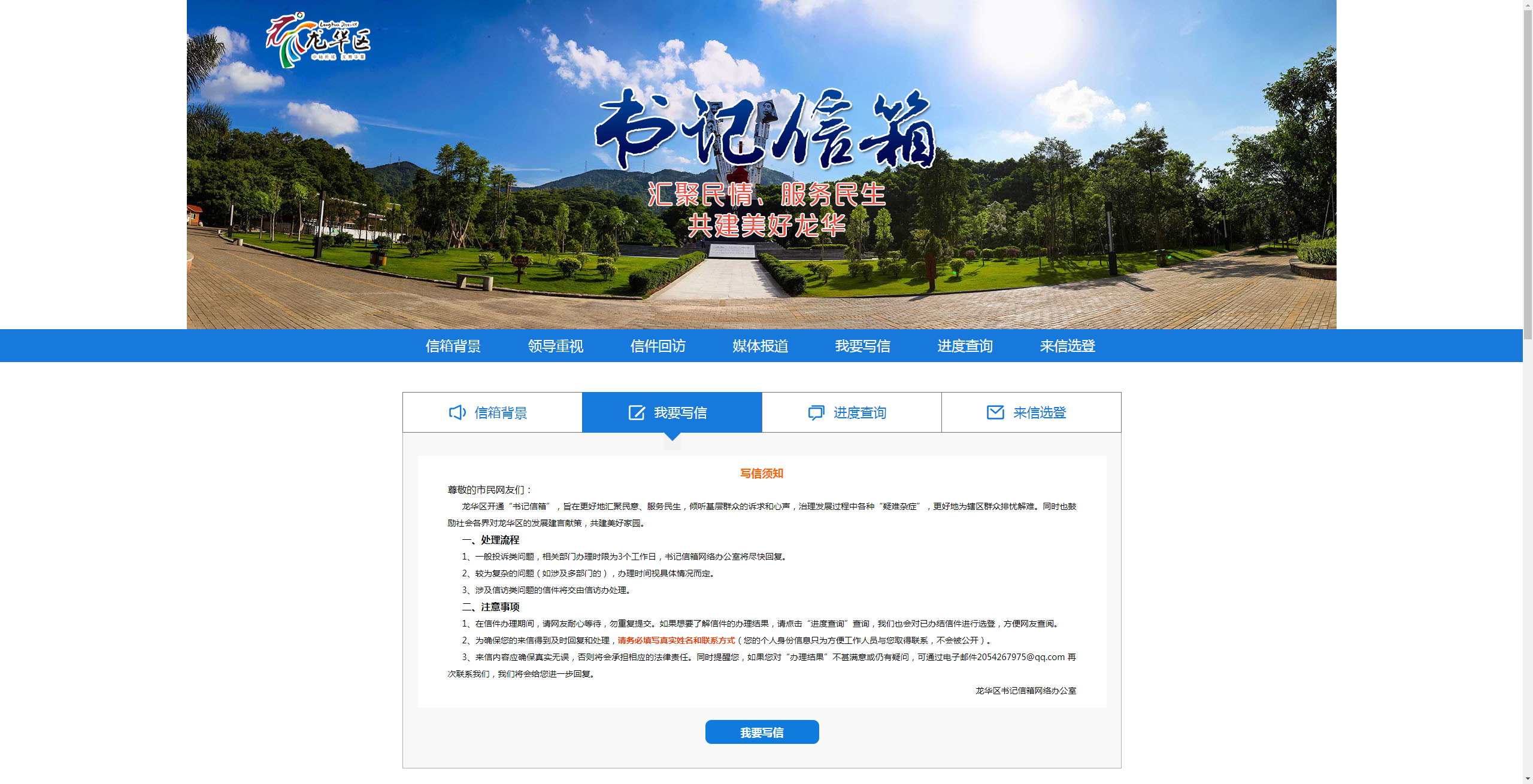 龍華區(qū)“書記信箱”網(wǎng)絡平臺是由龍華區(qū)領導的指導下搭建的網(wǎng)絡信息平臺,由深圳新聞網(wǎng)團隊進行開發(fā)搭建?!皶浶畔洹钡臉嫿ǎ驱埲A區(qū)委貫徹落實黨的群眾路線,踐行“三嚴三實”的一項新舉措?!皶浶畔洹弊?015年10月31日正式上線以來,逐步成為龍華市民向龍華區(qū)委反映、提出建議、意見和投訴請求的重要渠道。