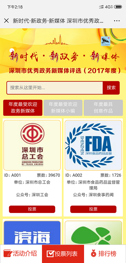 多個(gè)投票活動(dòng)已經(jīng)形成良好群眾效應(yīng),合作方主辦方多屆舉辦,每屆舉辦均由深圳新聞網(wǎng)負(fù)責(zé)投票系統(tǒng)開(kāi)發(fā),例如:健康場(chǎng)所投票、集團(tuán)攝影大賽評(píng)選投票、政務(wù)類投票。形成了良好品牌效應(yīng)和示范,往往一個(gè)區(qū)舉辦的投票活動(dòng)其他區(qū)會(huì)跟進(jìn)舉辦,形成系列投票,例如:“最美護(hù)士”系列投票,“最美醫(yī)生”系列投票,“最美教師”系列投票,“最佳政務(wù)”系列投票等;