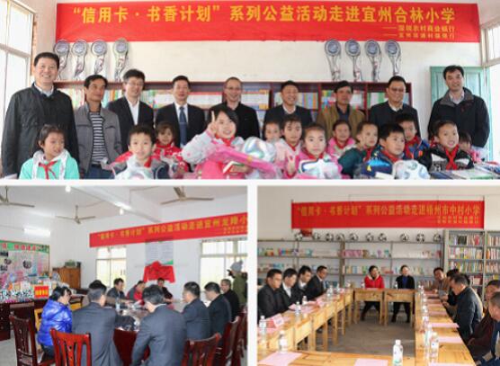 在2015年12月9日的信用卡發(fā)卡儀式上,深圳農(nóng)商行承諾客戶,持卡人每用深圳農(nóng)商行信用卡完成1筆交易,深圳農(nóng)商行就捐出0.1元,用于支援偏遠(yuǎn)貧困地區(qū)學(xué)校圖書室建設(shè)。涓涓細(xì)流,匯成大海,本次活動受到廣大客戶的踴躍參與和2016年,由深圳農(nóng)商行發(fā)起的“信用卡公益計劃·書香圖書室”捐贈活動,深入走進(jìn)廣西壯族自治區(qū)的偏遠(yuǎn)山區(qū),為當(dāng)?shù)剌^為貧困的學(xué)校學(xué)生送去溫暖。極支持。深圳農(nóng)商行“信用卡公益計劃·書香圖書室”活動的目標(biāo)是在全國建立100個圖書室,捐贈10萬冊圖書,希望能為孩子們的教育和成長貢獻(xiàn)一份力量。