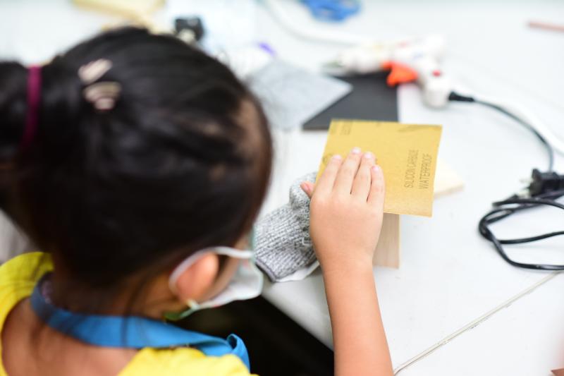 對(duì)于“小小木匠”來(lái)說(shuō),安安靜靜的坐下來(lái),發(fā)揮想象力,傾心打造屬于自己的木質(zhì)音樂(lè)盒,無(wú)疑是最開(kāi)心的時(shí)刻。聽(tīng)完老師的講解后,小朋友們迅速進(jìn)入角色,他們拿著原料木材,一個(gè)個(gè)化身“小魯班”,用尺子“計(jì)較長(zhǎng)短”,為它們“改頭換面”起來(lái)?;顒?dòng)現(xiàn)場(chǎng),一位小朋友正拿著砂紙,小心翼翼的打磨木料,再問(wèn)及他打磨的工序時(shí),小朋友頗具匠心的告誡記者:“先要用這種粗一點(diǎn)的砂紙打磨,再用這個(gè)細(xì)的,這樣打磨出來(lái)的音樂(lè)盒表面就特別光滑啦……”