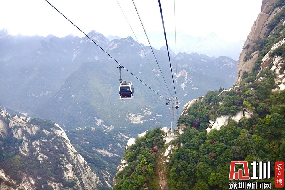 華山西峰的太華索道是迄今為止世界上第一條采取崖壁開鑿硐室站房、兩上兩下的起伏式走向、設(shè)中間站的單線循環(huán)脫掛式索道,總計(jì)投資5億余元建設(shè)。李酮攝。