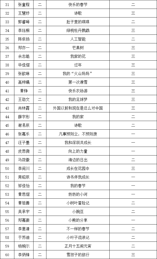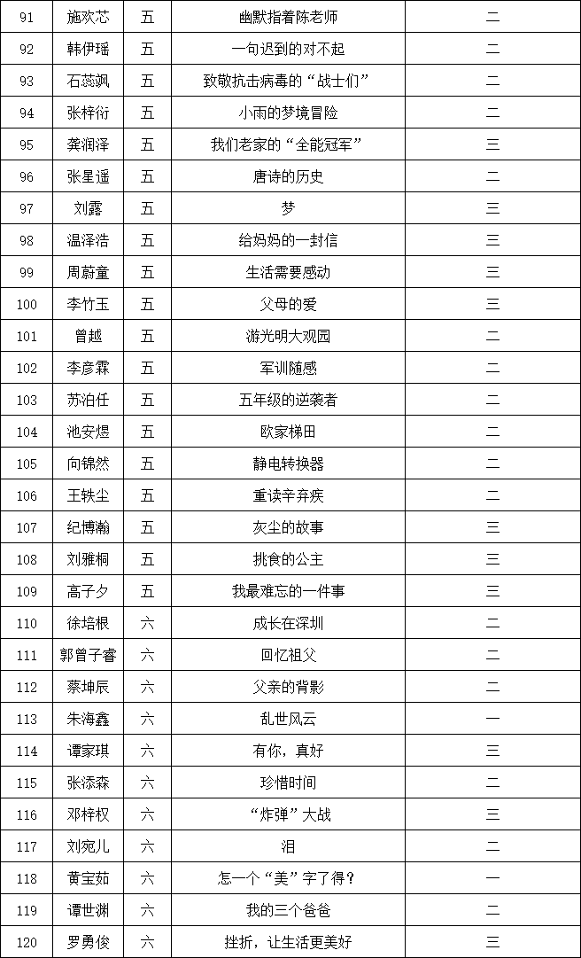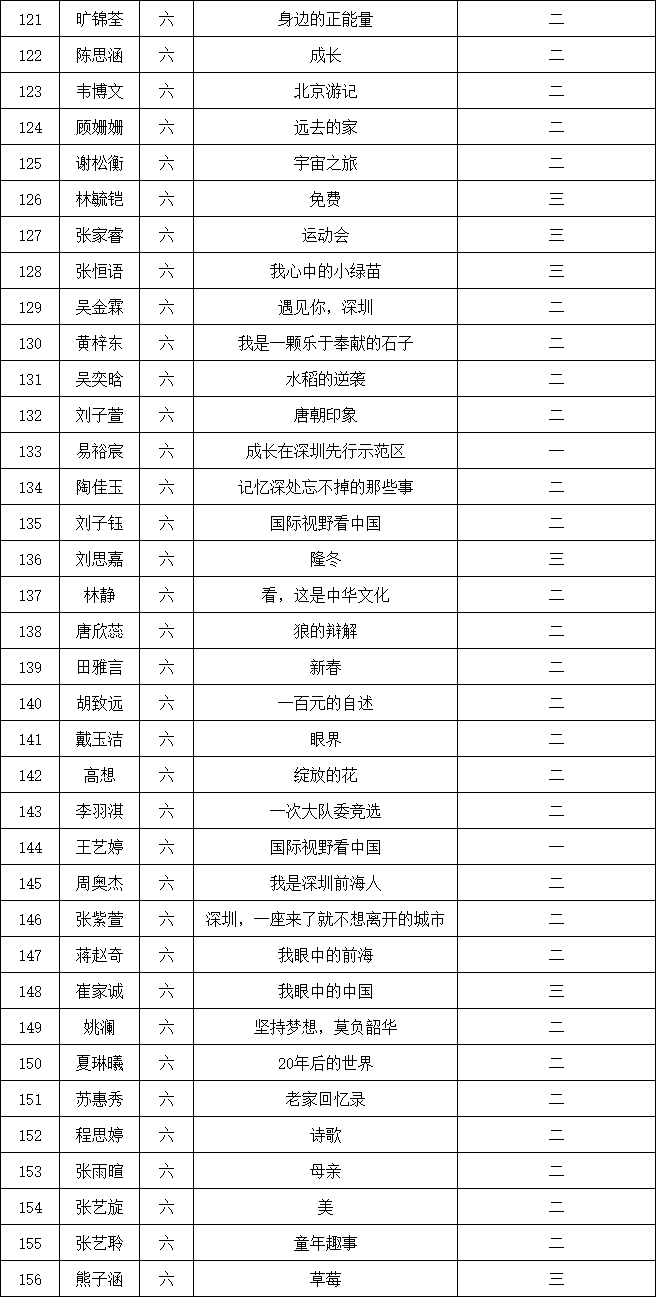 自2021年1月,活動(dòng)征稿啟動(dòng)以來,獲得了深圳市廣大中小學(xué)生、教師、文學(xué)愛好者的熱烈響應(yīng)積極參與,吸引了深圳百余所學(xué)校的上萬人關(guān)注報(bào)名?,F(xiàn)公布南山實(shí)驗(yàn)教育集團(tuán)前海港灣學(xué)校校園專場晉級(jí)復(fù)賽名單如下: