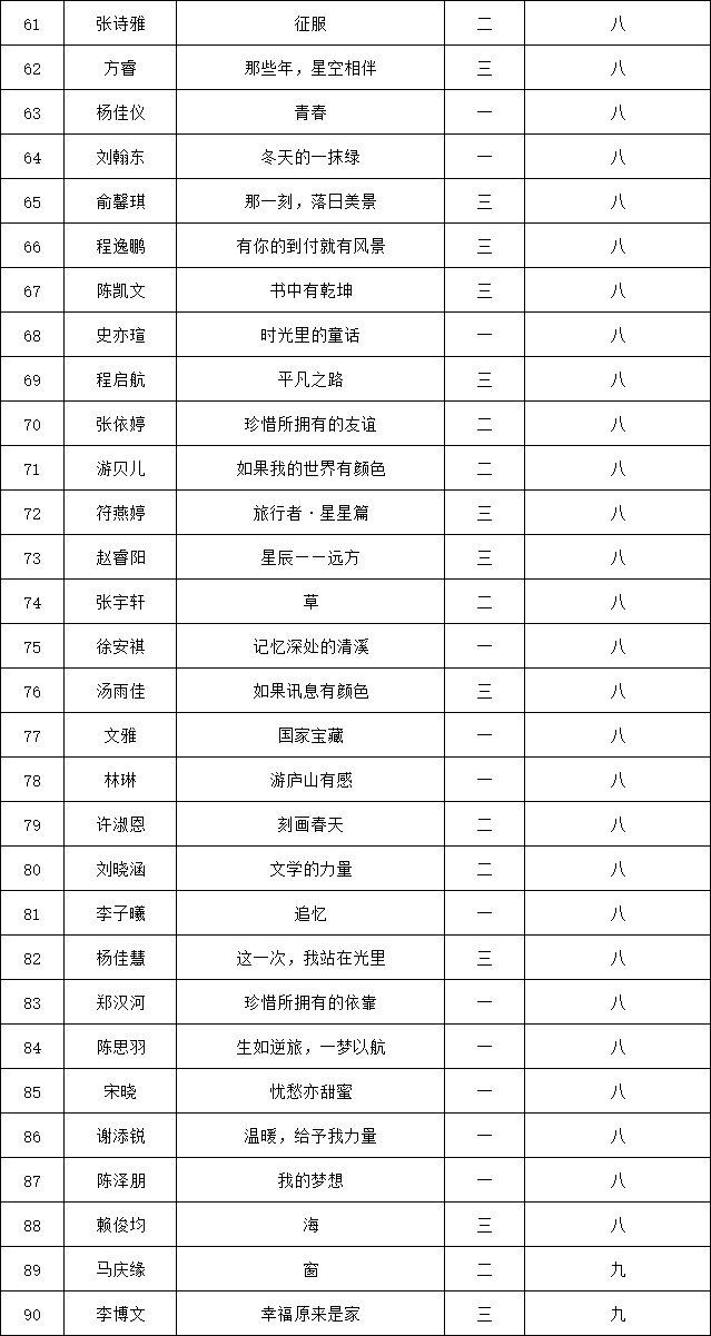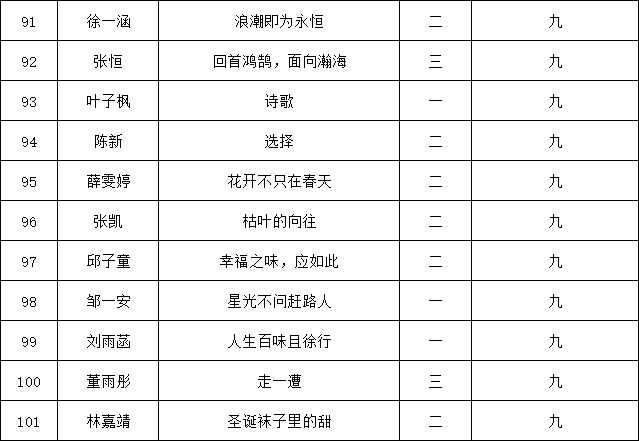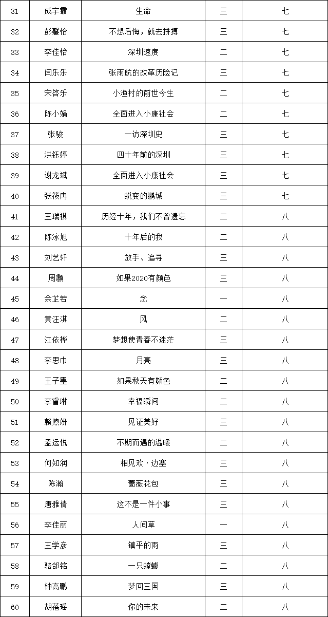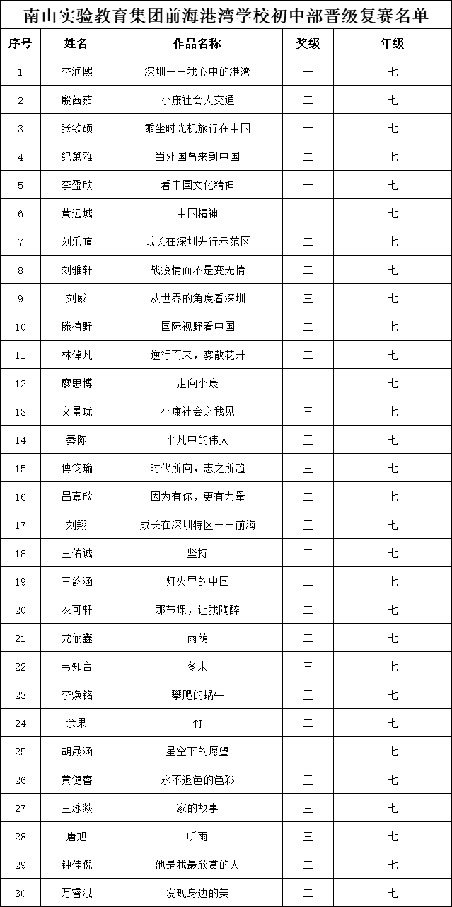 自2021年1月,活動(dòng)征稿啟動(dòng)以來(lái),獲得了深圳市廣大中小學(xué)生、教師、文學(xué)愛(ài)好者的熱烈響應(yīng)積極參與,吸引了深圳百余所學(xué)校的上萬(wàn)人關(guān)注報(bào)名。現(xiàn)公布南山實(shí)驗(yàn)教育集團(tuán)前海港灣學(xué)校(初中部)專場(chǎng)晉級(jí)復(fù)賽名單如下: