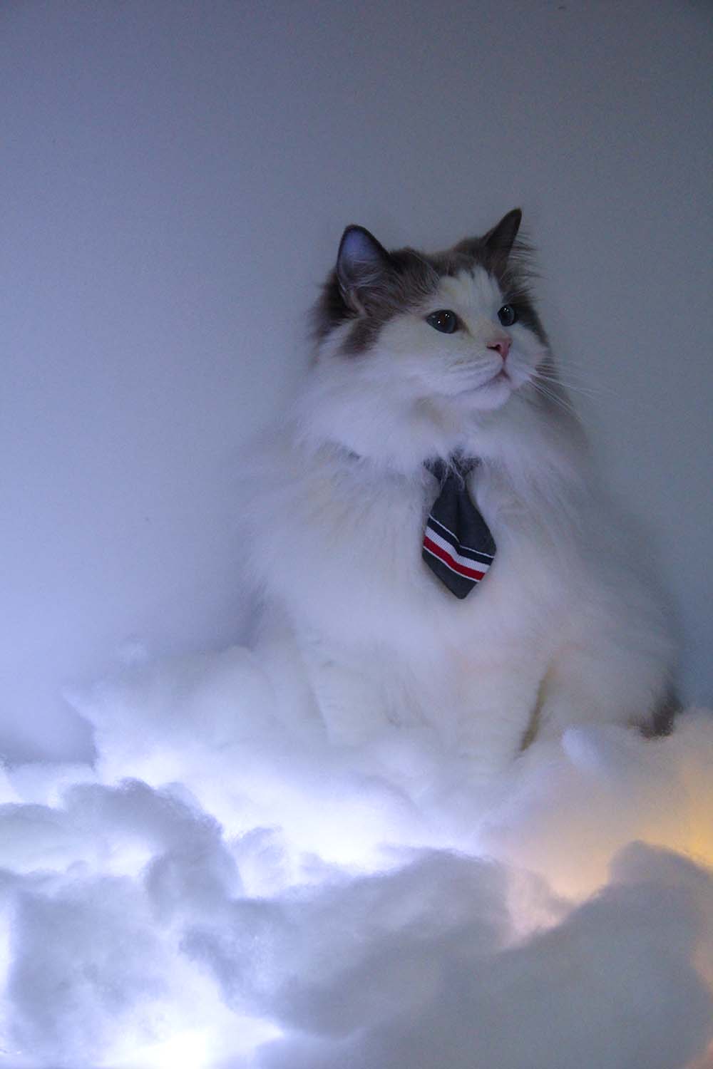 此次展出的拍攝主題有兩個(gè)系列。第一個(gè)系列主題為“云吸貓”,詞語(yǔ)本意是在網(wǎng)絡(luò)上吸貓,品牌團(tuán)隊(duì)以此作為靈感,設(shè)計(jì)云端的場(chǎng)景,打造出一組貓咪在云端的可愛(ài)作品。第二個(gè)系列則按照模特的風(fēng)格量身定制,充分展示了模特的個(gè)人風(fēng)采。