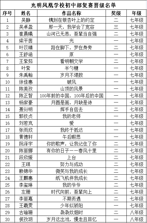 自2021年1月,活動(dòng)征稿啟動(dòng)以來,獲得了深圳市廣大中小學(xué)生、教師、文學(xué)愛好者的熱烈響應(yīng)積極參與,吸引了深圳百余所學(xué)校的上萬人關(guān)注報(bào)名?,F(xiàn)公布光明區(qū)鳳凰學(xué)校晉級復(fù)賽名單如下: