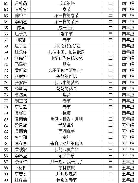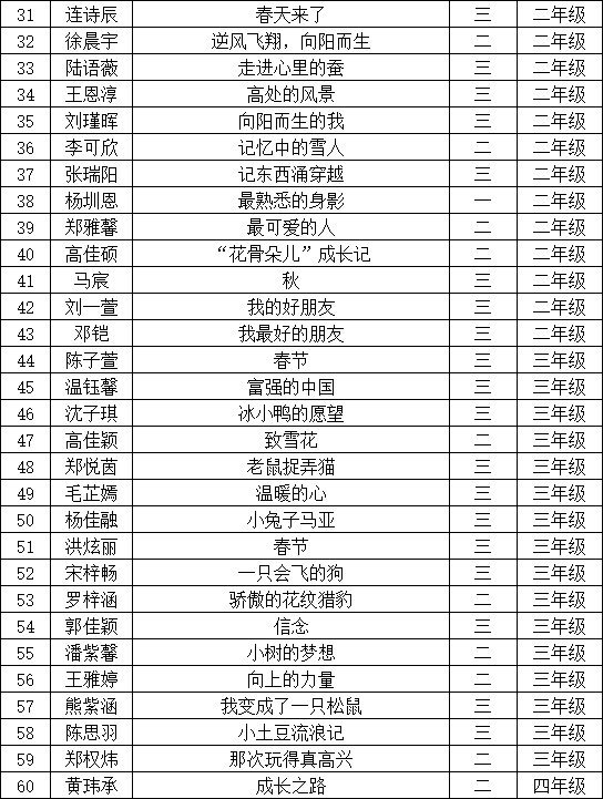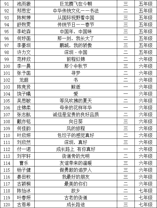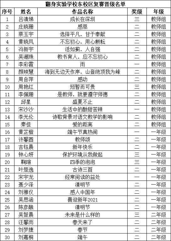 自2021年1月,活動征稿啟動以來,獲得了深圳市廣大中小學生、教師、文學愛好者的熱烈響應積極參與,吸引了深圳百余所學校的上萬人關注報名。現公布寶安區(qū)翻身實驗學校(東校區(qū))晉級復賽名單如下: