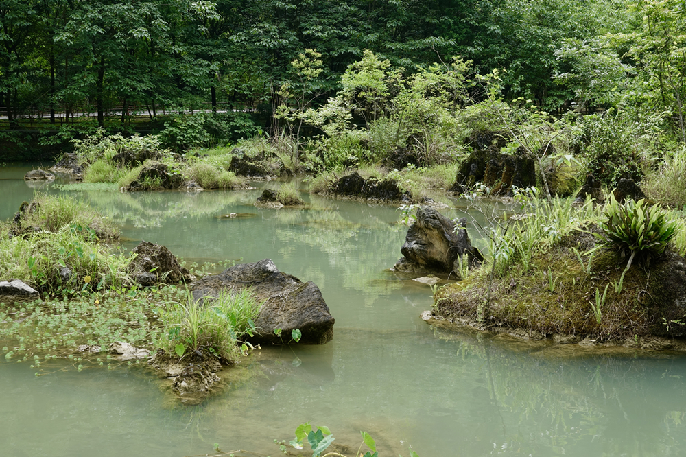 臥龍?zhí)哆吂质鏄淞至?,潭面如鏡子般平靜。李仁奇 攝