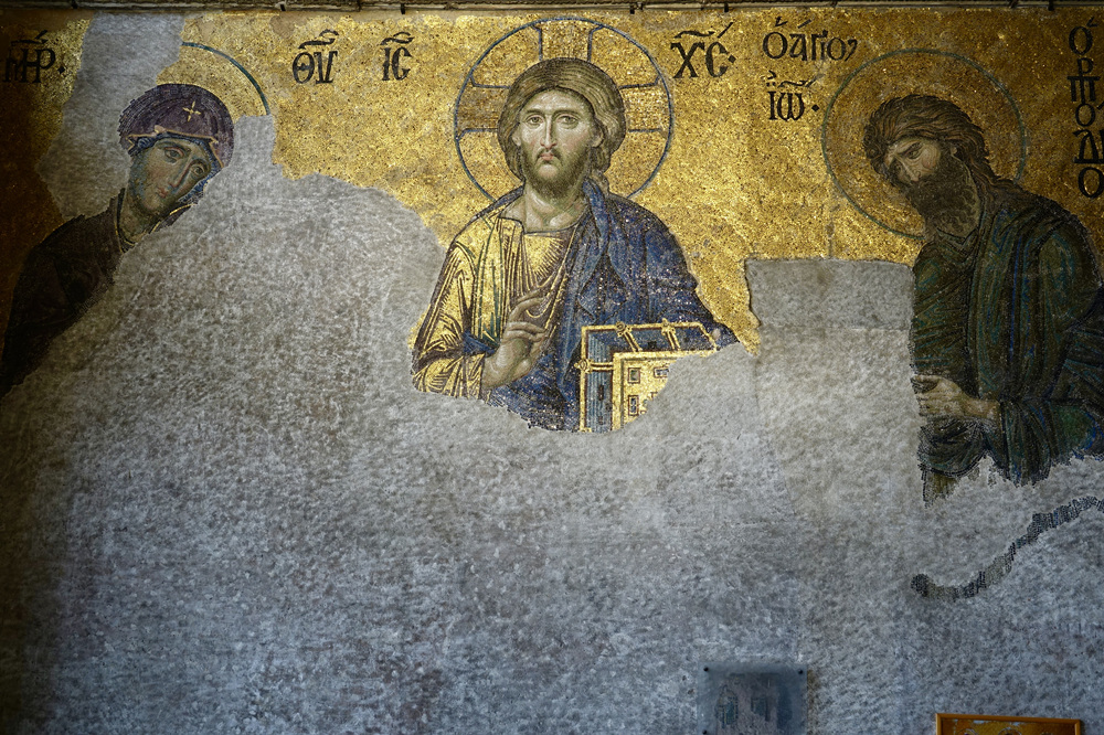 馬賽克《三圣像》,畫面下方已經(jīng)被嚴(yán)重?fù)p毀,但仍然能看到中央的耶穌基督,其兩側(cè)是圣母瑪利亞和施洗者約翰。李仁奇 攝