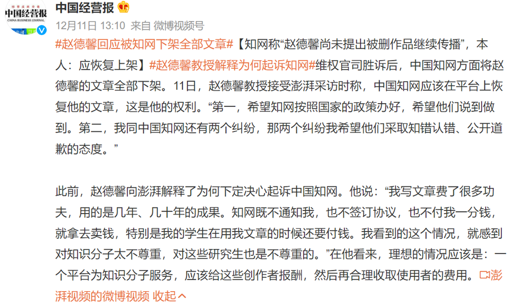 12月10日,中國知網(wǎng)向趙德鑫教授道歉,表示將妥當處理趙德鑫教授作品繼續(xù)在知網(wǎng)平臺傳播的問題。道歉中提到,2016年起,中國知網(wǎng)向全社會免費開放八年前出版的文獻,未來將進一步免費開放更多的學術(shù)資源。2019年起,所有在中國知網(wǎng)實名注冊的作者,可無限期免費使用自己的作品,管理自己的學術(shù)成果,并隨時跟蹤其研究成果的學術(shù)影響。