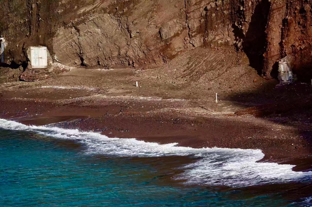 紅沙灘距離阿科羅提利遺址不遠(yuǎn),這里像是神話一般的地方。海水被大片深紅色高聳的山巖所包圍,紅色沙灘十分罕見,在陽光的照耀下更加顯得耀眼奪目。李仁奇 攝