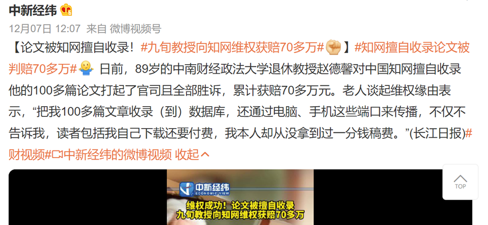 10.【法治事件】89歲退休法學(xué)教授趙德馨,從中國(guó)知網(wǎng)那里討回了自己160多篇稿件70多萬(wàn)元元的收入,成為目前已知第一個(gè)向中國(guó)知網(wǎng)維權(quán)成功的勝訴案例。