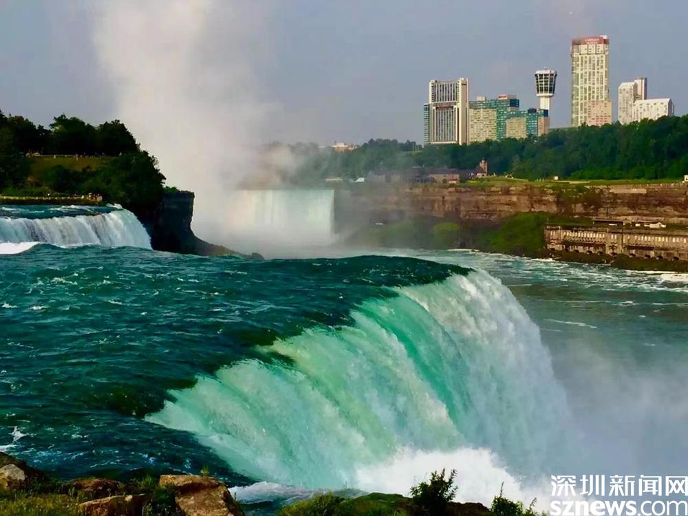 從加拿大這邊的觀景臺(tái)和河岸的維多利亞皇后公園可以看到尼亞加拉瀑布?jí)邀惖娜?,而美?guó)的瀑布城則只能看到局部。李仁奇 攝