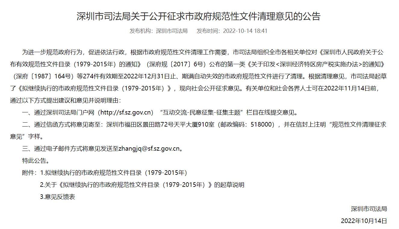 讀特客戶端·深圳新聞網(wǎng)2022年10月20日訊(記者 翁任瑩)近日,深圳市司法局就《擬繼續(xù)執(zhí)行的市政府規(guī)范性文件目錄(1979-2015年)》向社會公開征求意見,擬對274件有效期至2022年12月31日止、期滿自動失效的市政府規(guī)范性文件進行清理。