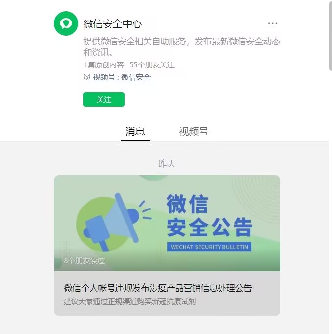 公告強(qiáng)調(diào),“利用微信個人帳號發(fā)布抗原檢測試劑、藥品等營銷信息的行為,違反了相關(guān)法律法規(guī),也違反了《微信個人帳號使用規(guī)范》,微信安全團(tuán)隊(duì)將對違法違規(guī)行為進(jìn)行堅(jiān)決處理、嚴(yán)厲打擊。”
