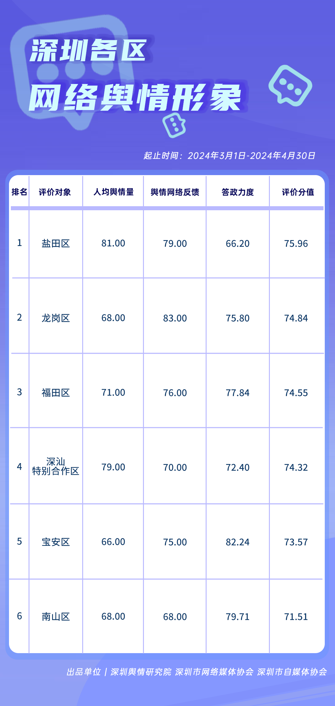 3-4月《深圳各區(qū)網(wǎng)絡(luò)輿情形象榜》中,鹽田區(qū)、龍崗區(qū)、福田區(qū)、深汕特別合作區(qū)、寶安區(qū)和南山區(qū)分別居于前六名,是這六個區(qū)在過去兩個月內(nèi)積極維護良好網(wǎng)絡(luò)輿論環(huán)境,強化網(wǎng)絡(luò)輿情引導(dǎo)與治理的反映??傮w看來,鹽田區(qū)的網(wǎng)絡(luò)輿情治理水平較為穩(wěn)定,連續(xù)兩次登上榜首,從中可以看出該區(qū)對網(wǎng)絡(luò)輿情管理的重視程度。龍崗區(qū)、福田區(qū)、深汕特別合作區(qū)、寶安區(qū)和南山區(qū)在網(wǎng)絡(luò)輿情形象塑造過程中則各有側(cè)重,包括主動應(yīng)對網(wǎng)絡(luò)輿情危機、積極開展網(wǎng)絡(luò)答政工作等,最終也收獲了理想成效。