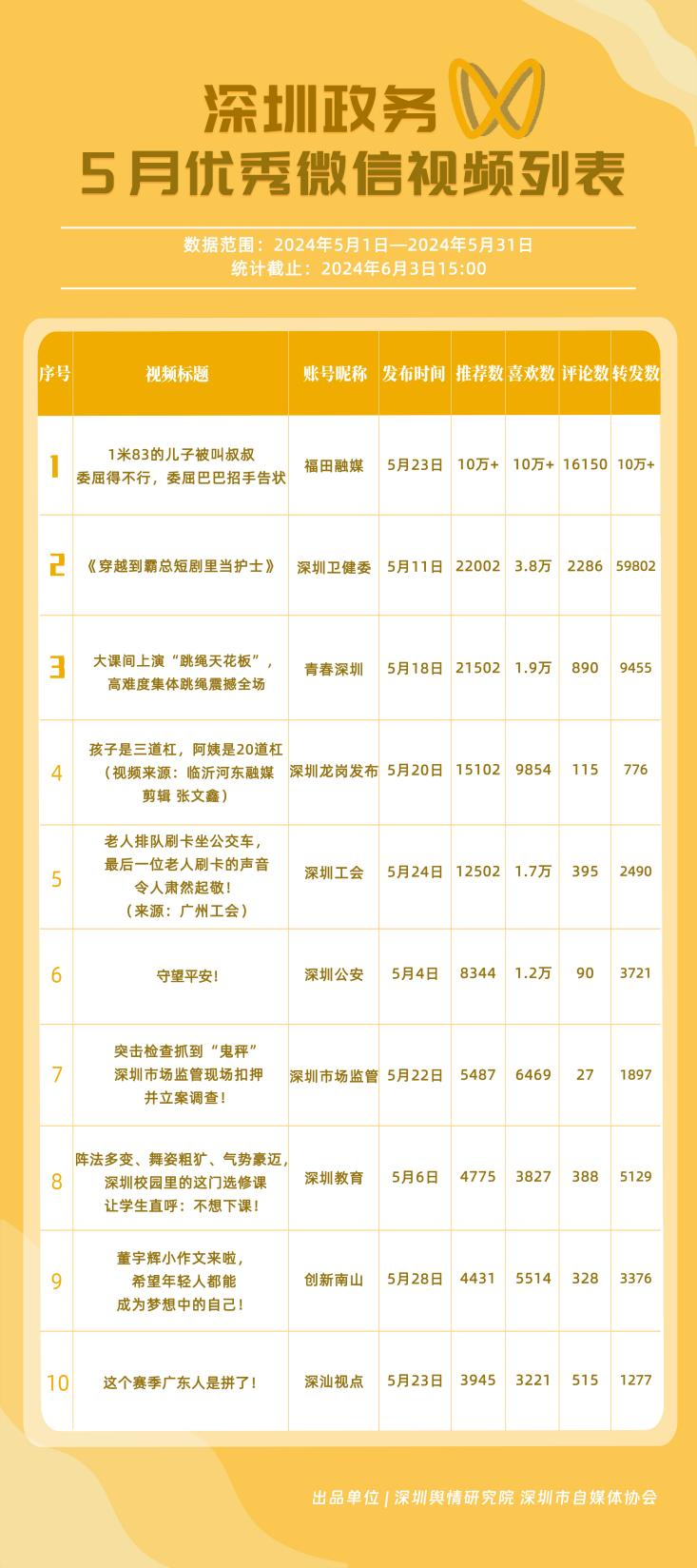 5月,政務微信視頻號“福田融媒”“深圳衛(wèi)健委”“深圳教育”“青春深圳”“深圳天氣”“創(chuàng)新南山”“深汕觀點”“深圳龍崗發(fā)布”“深圳工會”和“深圳市場監(jiān)管”入選“深圳優(yōu)秀政務微信視頻號”,以上上榜單位都能夠在持續(xù)發(fā)揮政務單位主體功能的同時,穩(wěn)定輸出觀眾所需的優(yōu)質內容。結合整體數(shù)據(jù)來看,5月深圳政務視頻號平臺內容百花齊放,出現(xiàn)多個優(yōu)質、熱門作品,如《1米83的兒子被叫叔叔委屈得不行,委屈巴巴招手告狀》《穿越到霸總短劇里當護士》等,是各上榜單位積極探索政務新媒體正能量傳播機制的良好體現(xiàn)。