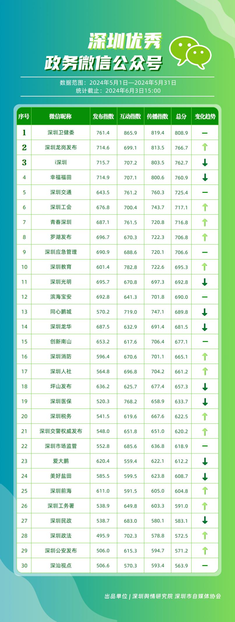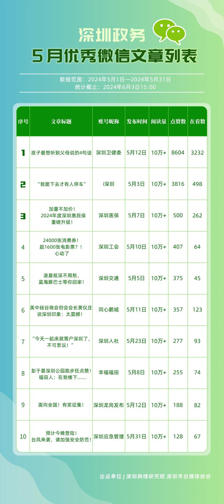 5月,“深圳衛(wèi)健委”“深圳龍崗發(fā)布”“i深圳”“幸福福田”“深圳交通”“深圳工會”“青春深圳”“羅湖發(fā)布”“深圳應急管理”“深圳教育”等30個政務微信公眾號,被評為“深圳優(yōu)秀政務微信公眾號”。5月,“深圳衛(wèi)健委”憑借精心創(chuàng)作的內容、與受眾深入互動,多篇作品深受好評,榮登榜單首位。“深圳龍崗發(fā)布”“i深圳”“幸福福田”“深圳交通”等上榜公眾號也積極捕捉觀眾優(yōu)質作品需求,把握主流熱點趨勢,集中發(fā)揮政務媒體傳播力量,在本期也取得了較為亮眼的成績,進一步推動了政務信息傳播工作提質增效。