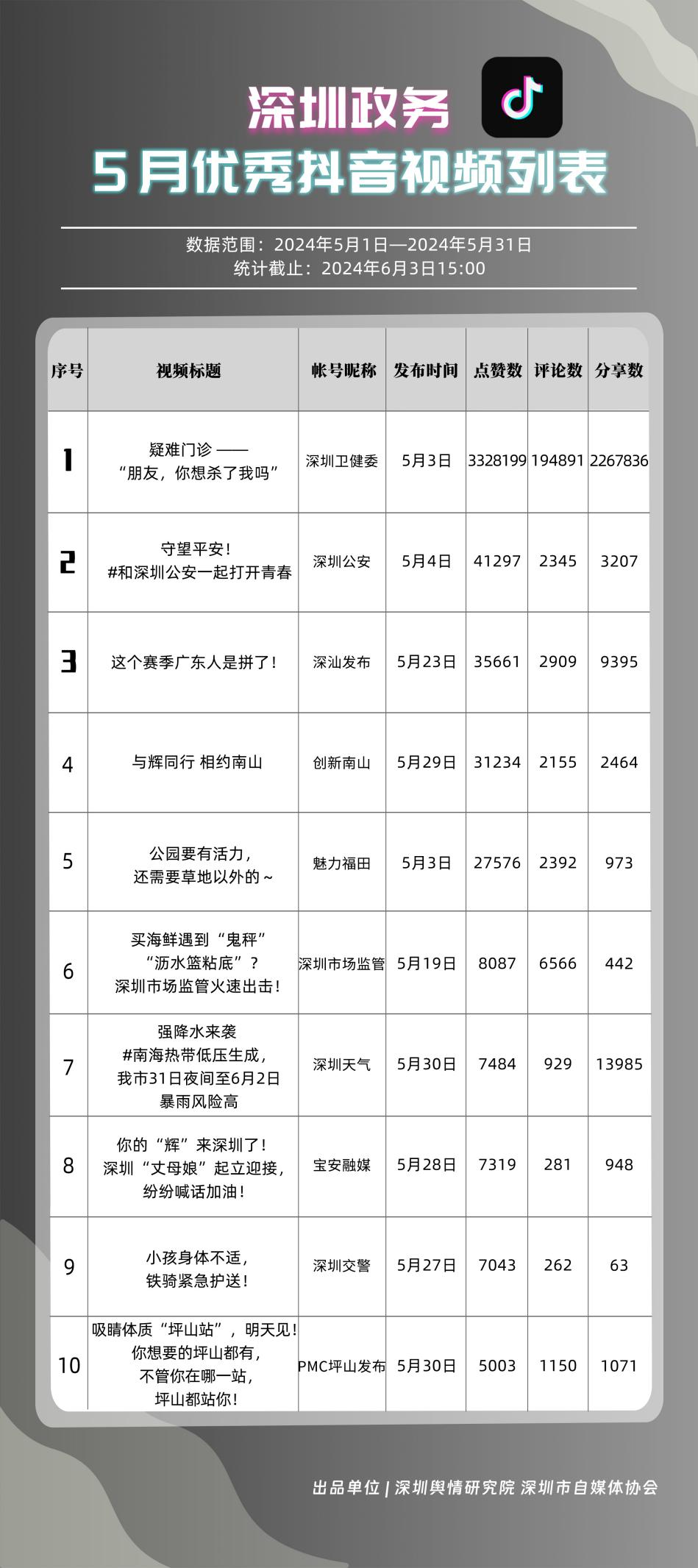 5月,共有10個政務抖音號獲得“深圳優(yōu)秀政務抖音號”稱號,分別是“深圳衛(wèi)健委”“魅力福田”“DOU愛龍華”“創(chuàng)新南山”“深圳天氣”“深汕發(fā)布”“掌上龍崗”“深圳交警”“PMC坪山發(fā)布”和“深圳公安”,多個政務抖音號能夠把握短視頻平臺宣傳要領,持續(xù)發(fā)布優(yōu)質信息內容,做到了政務便民化、政務信息傳播高效化,為政務信息發(fā)布模式開創(chuàng)新渠道樹立了良好典范。