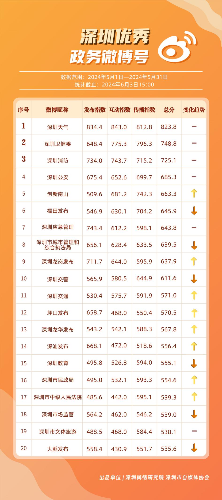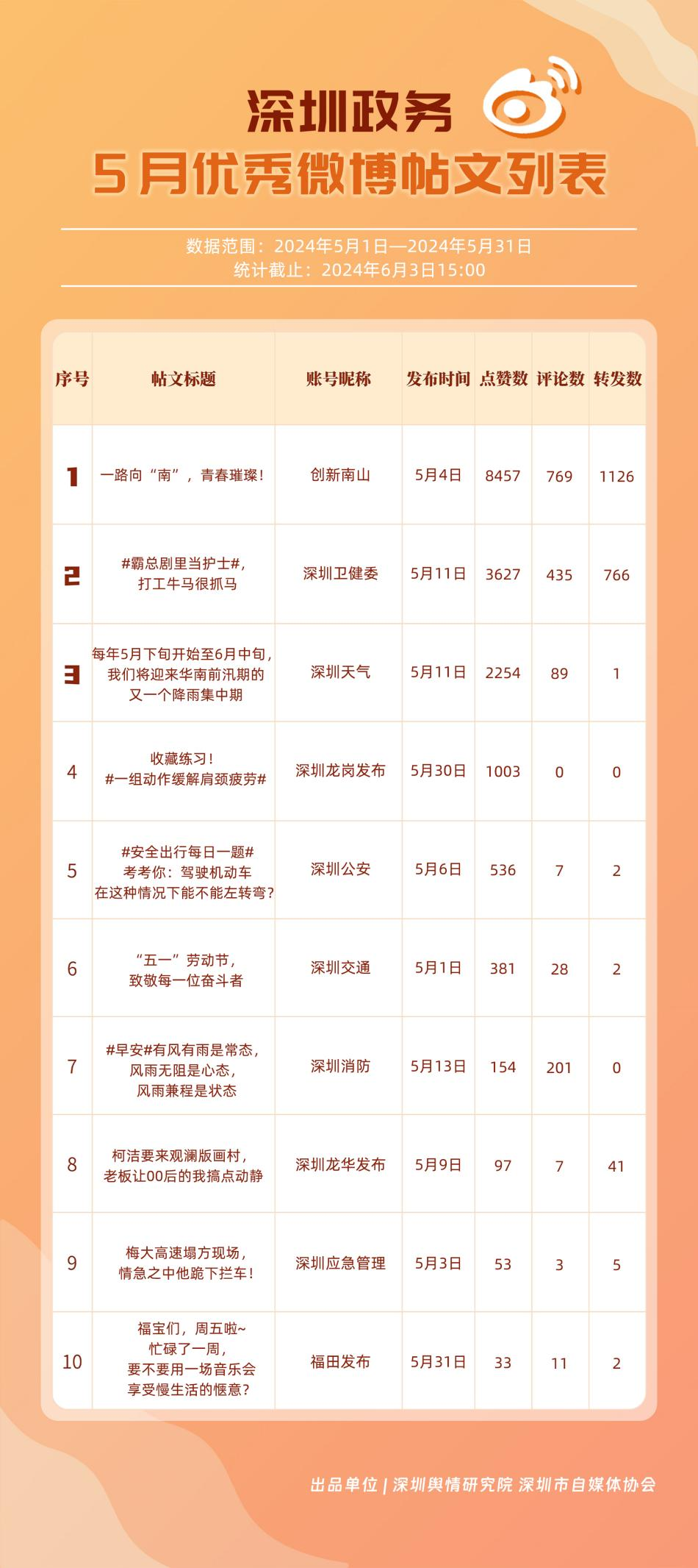 5月,“深圳天氣”“深圳衛(wèi)健委”“深圳消防”“深圳公安”“創(chuàng)新南山”“福田發(fā)布”“深圳應急管理”“深圳市城市管理和綜合執(zhí)法局”“深圳龍崗發(fā)布”“深圳交警”等20個政務微博號入列“優(yōu)秀”名單。對比上期來看,“深圳天氣”“深圳衛(wèi)健委”“深圳消防”“深圳公安”發(fā)揮穩(wěn)定,能夠合理利用微博傳播渠道,持續(xù)輸出受眾喜聞樂見的高質量內容,“創(chuàng)新南山”“深圳龍崗發(fā)布”等微博號則在5月發(fā)力宣傳,整體傳播效果有所提升,收獲網民好評。