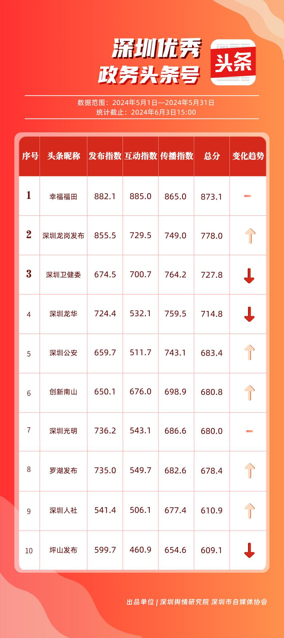 5月,“幸福福田”“深圳龍崗發(fā)布”“深圳衛(wèi)健委”“深圳龍華”“深圳公安”“創(chuàng)新南山”“深圳光明”“羅湖發(fā)布”“深圳人社”“坪山發(fā)布”共10個政務頭條號能夠及時發(fā)布政務信息及公共服務信息,服務經濟社會發(fā)展,滿足公眾信息需求,位列“優(yōu)秀政務頭條號”榜單,《廣東人將挑戰(zhàn)暴雨上班30天》《幫朋友問:“口~”會不會傳染艾滋?。俊返葍?yōu)秀文章資訊深入人心。其他未上榜單位應積極運用該新媒體平臺助力政務公開,讓權威聲音有效傳播到目標受眾,更好地服務人民群眾。