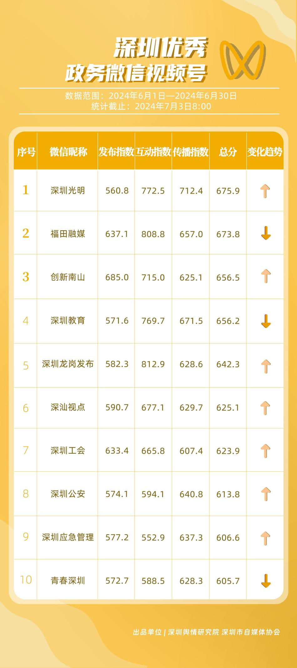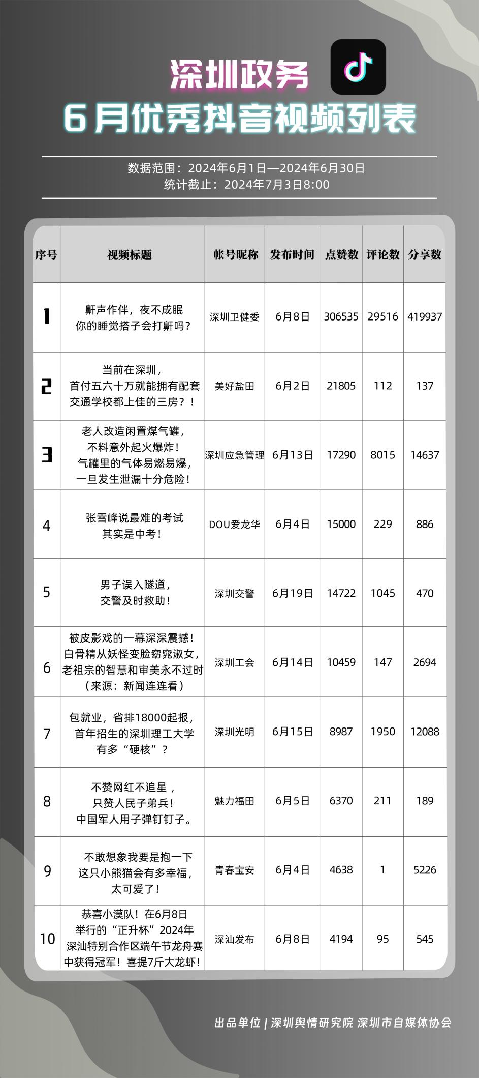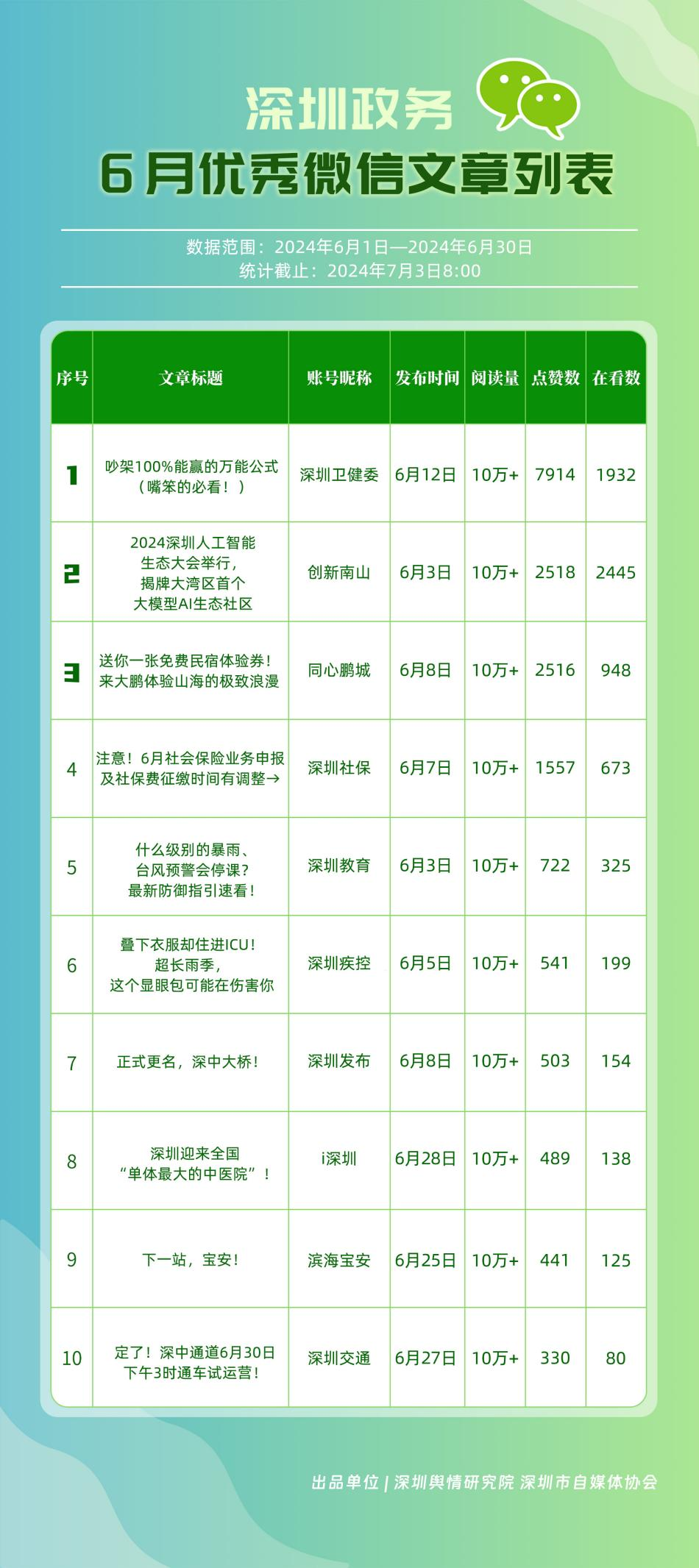 6月,“深圳衛(wèi)健委”“i深圳”“深圳龍崗發(fā)布”“幸福福田”“深圳交通”“深圳教育”“濱海寶安”“創(chuàng)新南山”“深圳工會(huì)”“青春深圳”“同心鵬城”“深圳光明”等30個(gè)政務(wù)微信公眾號(hào),被評(píng)為“深圳優(yōu)秀政務(wù)微信公眾號(hào)”。6月,“深圳衛(wèi)健委”因內(nèi)容策劃出色、受眾互動(dòng)活躍、作品火熱“出圈”等,榮登排行榜首位?!皠?chuàng)新南山”“同心鵬城”“深圳社?!薄吧钲诮逃钡壬习窆娞?hào)也積極創(chuàng)作優(yōu)質(zhì)作品,抓住時(shí)下熱點(diǎn)趨勢(shì),集中發(fā)揮政務(wù)媒體傳播力量,推動(dòng)了政務(wù)信息傳播工作提質(zhì)增效。
