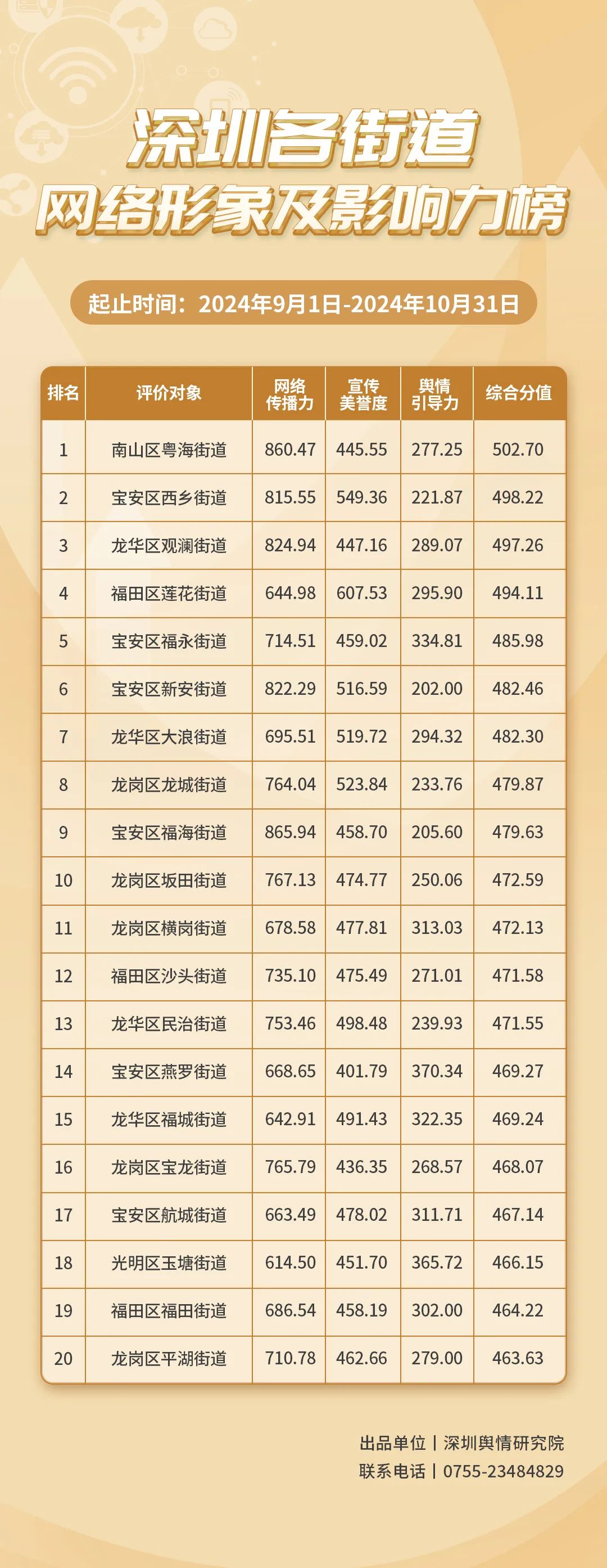 2024年9-10月,各街道不斷探索治理新路徑,力求效能躍升,《深圳各街道網(wǎng)絡(luò)形象及影響力榜》為您揭曉哪些街道網(wǎng)絡(luò)形象治理實效顯著,成標(biāo)桿,本期榜單數(shù)據(jù)統(tǒng)計范圍為2024年9月1日至10月31日。