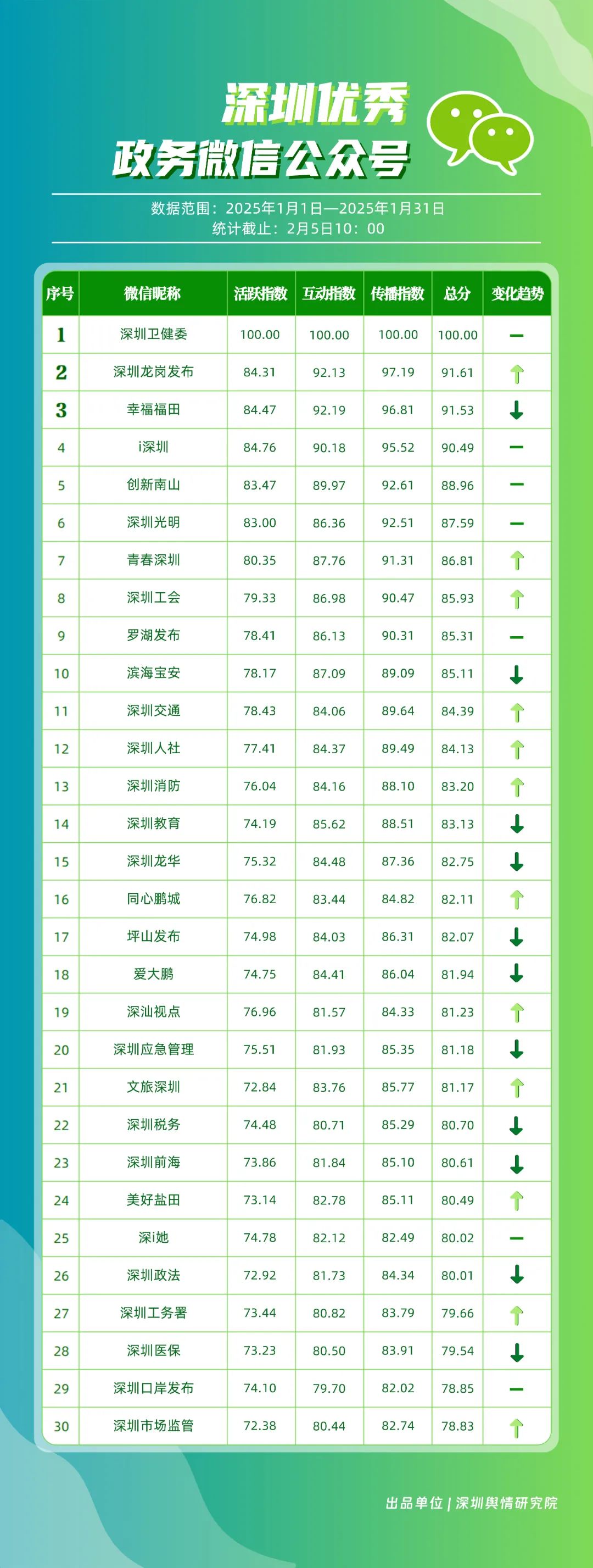 1月,“深圳衛(wèi)健委”“深圳龍崗發(fā)布”“幸福福田”“i深圳”“創(chuàng)新南山”“深圳光明”“青春深圳”“深圳工會(huì)”“羅湖發(fā)布”“濱海寶安”等30個(gè)賬號(hào)入選“深圳優(yōu)秀政務(wù)微信公眾號(hào)”。其中,“深圳衛(wèi)健委”各方面表現(xiàn)卓越,位于榜單首位,獲得總分100分。“深圳龍崗發(fā)布”“青春深圳”“深圳工會(huì)”排名在本期有所提升,反映了這些賬號(hào)在內(nèi)容創(chuàng)新與受眾互動(dòng)方面的不懈努力?!癷深圳”“創(chuàng)新南山”“深圳光明”“羅湖發(fā)布”則保持了穩(wěn)健的排名,持續(xù)在政務(wù)信息的傳播中扮演著不可或缺的角色。