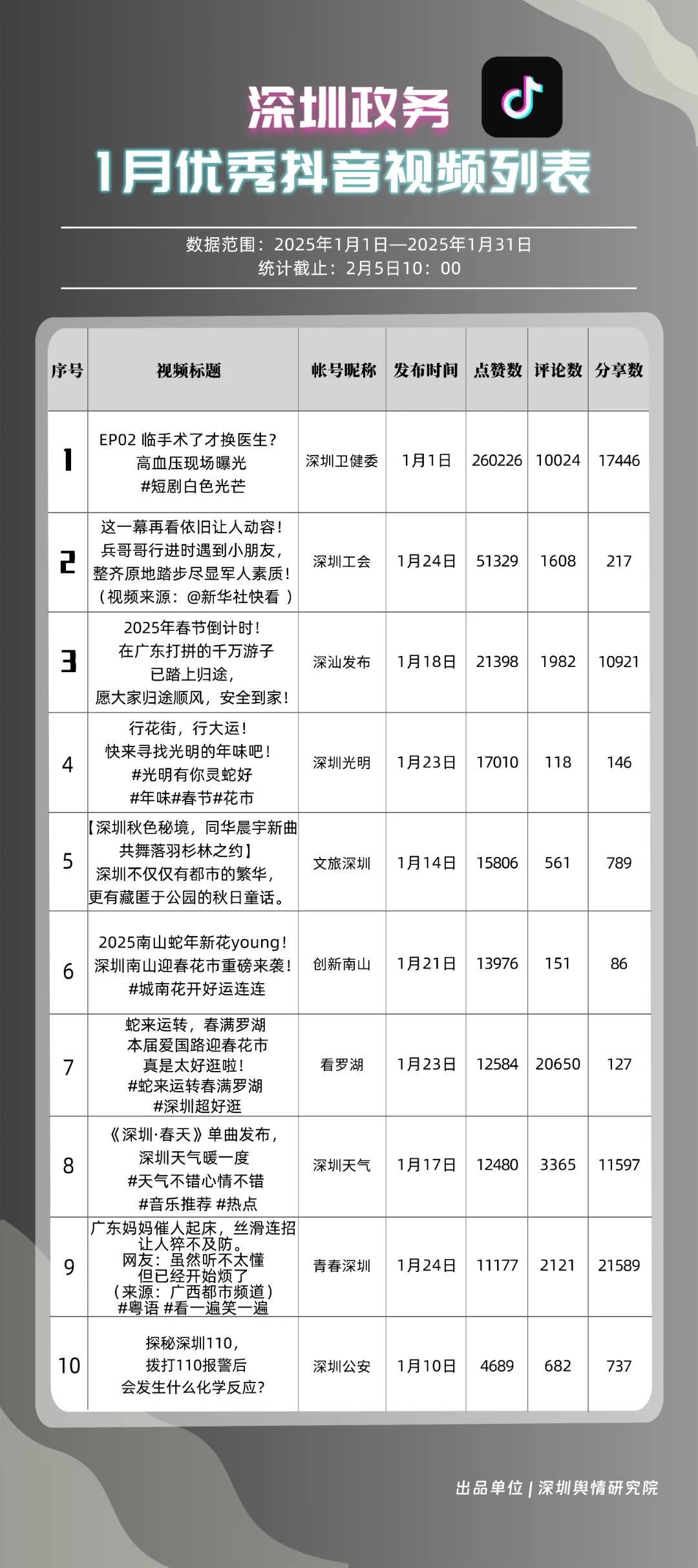1月,“深圳衛(wèi)健委”“深汕發(fā)布”“深圳天氣”“青春深圳”“看羅湖”“掌上龍崗”“深圳工會(huì)”“創(chuàng)新南山”“文旅深圳”“深圳公安”共10個(gè)政務(wù)抖音號(hào)獲得“深圳優(yōu)秀政務(wù)抖音號(hào)”稱號(hào)?!吧钲谛l(wèi)健委”“深汕發(fā)布”“深圳天氣”成績(jī)優(yōu)異,綜合實(shí)力較強(qiáng),位于榜單前列。“青春深圳”“看羅湖”等賬號(hào)排名有所提升,彰顯了這些賬號(hào)在拓寬受眾基礎(chǔ)、增強(qiáng)用戶黏性等方面所取得的積極成效。