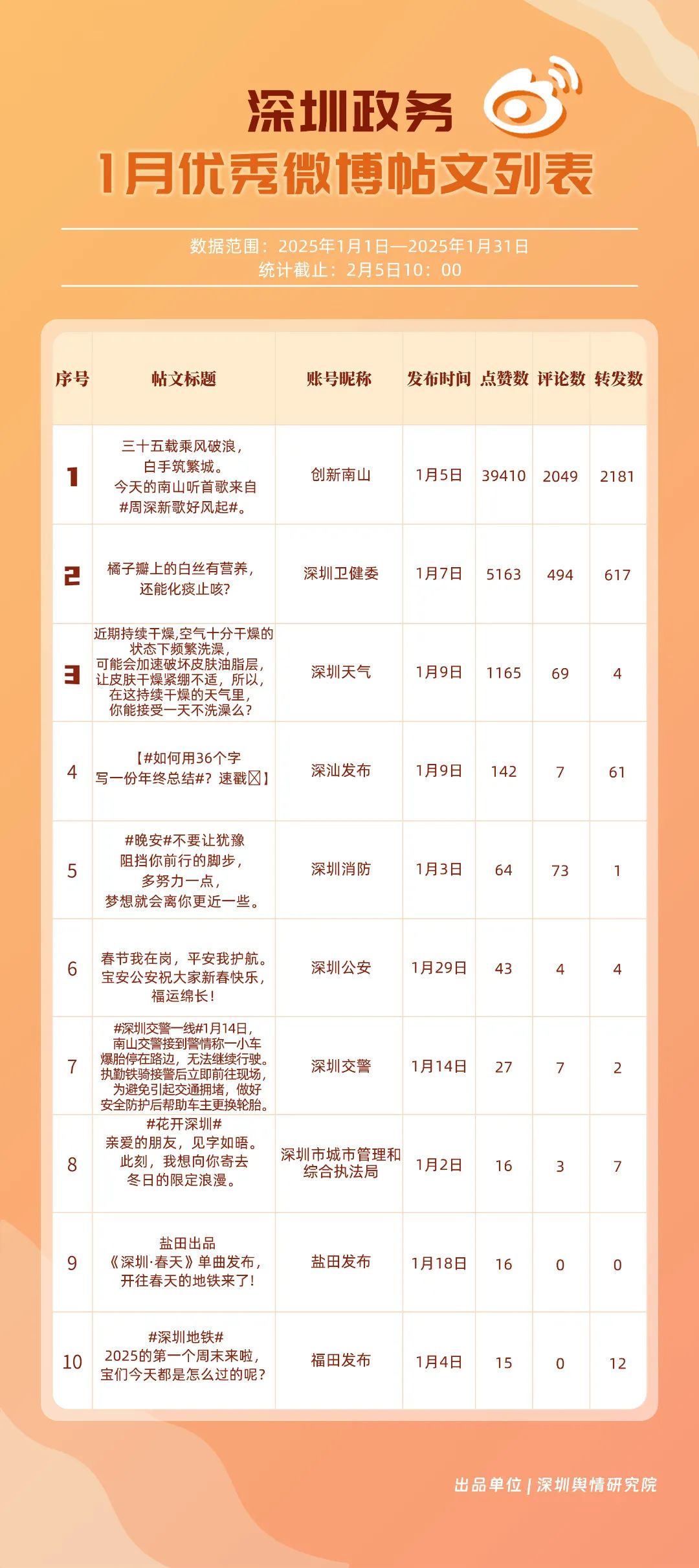 1月,“深圳天氣”“創(chuàng)新南山”“深圳衛(wèi)健委”“深圳消防”“福田發(fā)布”“深圳應(yīng)急管理”“深圳公安”“深汕發(fā)布”“深圳龍崗發(fā)布”“深圳交警”等20個(gè)賬號(hào)入選“優(yōu)秀政務(wù)微博號(hào)”?!吧钲谔鞖狻睉{借高活躍度、互動(dòng)量等獲得滿分,“創(chuàng)新南山”“深圳衛(wèi)健委”賬號(hào)則在1月發(fā)力宣傳,排名上升至榜單第二、三位。同時(shí),“深圳消防”“福田發(fā)布”“深圳應(yīng)急管理”賬號(hào)總分在90分以上,彰顯了他們?cè)谔嵘姲踩庾R(shí)、促進(jìn)政民互動(dòng)等方面所做出的積極貢獻(xiàn)。