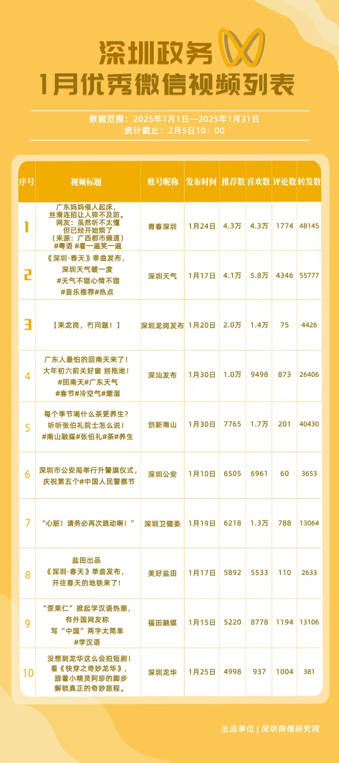 1月,獲“深圳優(yōu)秀政務(wù)微信視頻號(hào)”稱號(hào)的分別是“深汕發(fā)布”“深圳天氣”“青春深圳”“創(chuàng)新南山”“深圳衛(wèi)健委”“深圳龍崗發(fā)布”“福田融媒”“深圳應(yīng)急管理”“深圳光明”“深圳公安”。其中,“深汕發(fā)布”互動(dòng)、傳播數(shù)據(jù)較高,占據(jù)榜單首位。“深圳天氣”“青春深圳”具有較高活躍度,互動(dòng)數(shù)據(jù)良好,總分超95分,位于榜單第二、三名?!皠?chuàng)新南山”“深圳衛(wèi)健委”“深圳應(yīng)急管理”“深圳公安”在排名上有所上升,彰顯了這些賬號(hào)在提升政務(wù)信息傳播效率等方面有所作為。