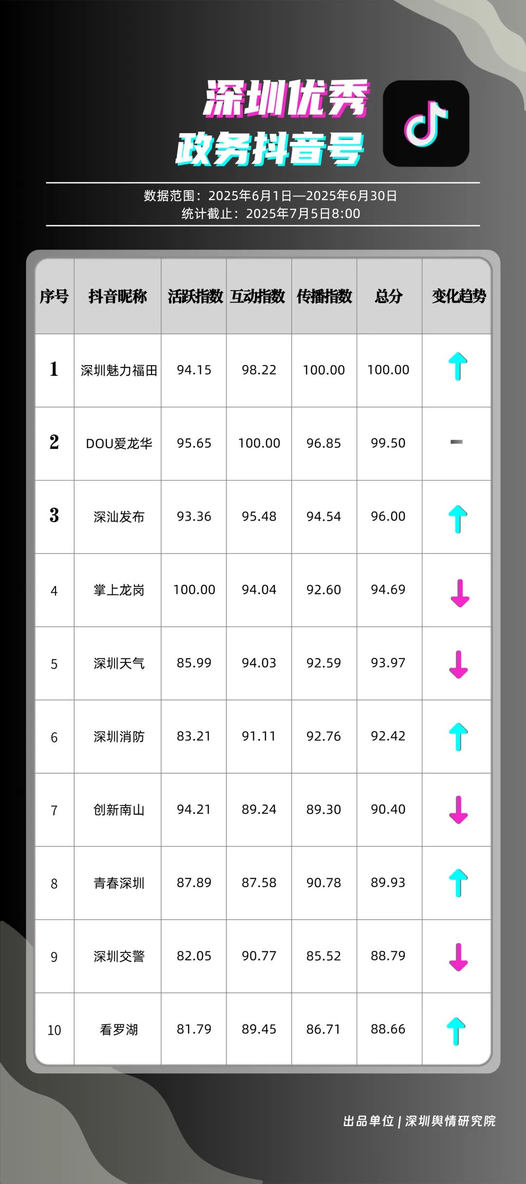 6月,“深圳魅力福田”“DOU愛龍華”“深汕發(fā)布”“掌上龍崗”“深圳天氣”“深圳消防”“創(chuàng)新南山”“青春深圳”“深圳交警”“看羅湖”共10個(gè)政務(wù)抖音號(hào)獲得“優(yōu)秀政務(wù)抖音號(hào)”稱號(hào)。6月,“深圳魅力福田”登頂,憑借其城市人文、社會(huì)熱點(diǎn)類主題短視頻,在傳播指數(shù)得分創(chuàng)新高;“DOU愛龍華”“深汕發(fā)布”“掌上龍崗”緊隨其后,通過(guò)各類熱點(diǎn)、創(chuàng)意內(nèi)容提升傳播效能?!吧钲谔鞖狻薄吧钲谙馈币脖憩F(xiàn)突出,短視頻內(nèi)容兼具“信息傳遞”與“情感共鳴”,用戶參與度持續(xù)提升,不斷為網(wǎng)民傳播有價(jià)值的政務(wù)信息資訊。