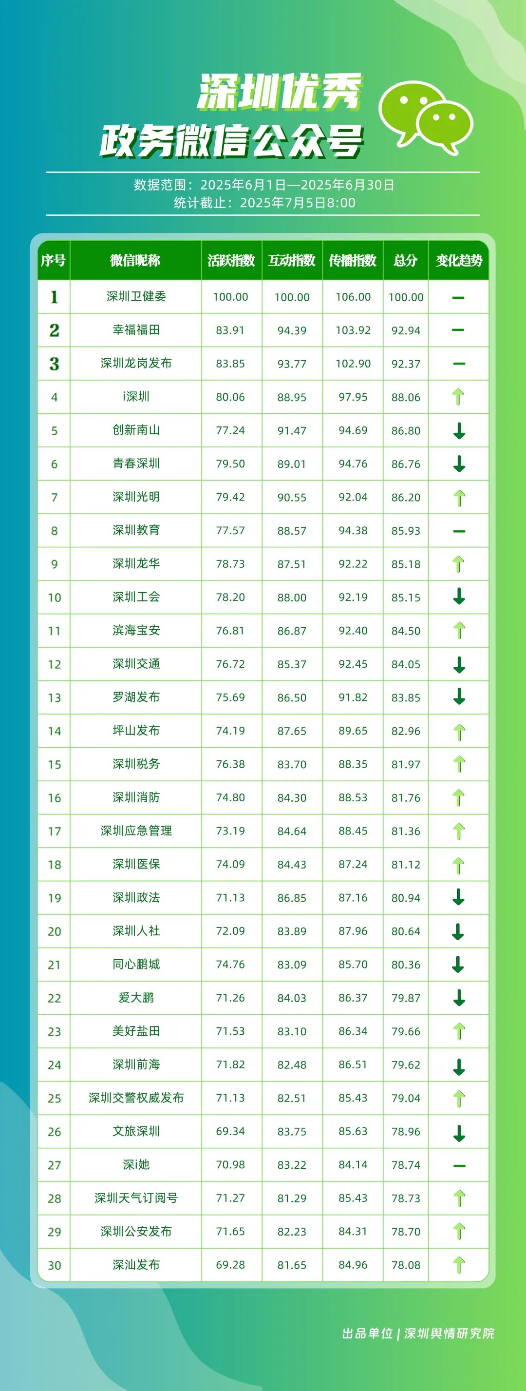 6月,30個(gè)政務(wù)微信公眾號(hào)入選“深圳優(yōu)秀政務(wù)微信公眾號(hào)”榜單,其中包括“深圳衛(wèi)健委”“幸福福田”“深圳龍崗發(fā)布”“i深圳”“創(chuàng)新南山”“青春深圳”“深圳光明”“深圳教育”“深圳龍華”“深圳工會(huì)”等。6月,榜單前三名的賬號(hào)保持穩(wěn)定,且各創(chuàng)作出多篇閱讀量超10萬(wàn)次的優(yōu)質(zhì)文章,傳播指數(shù)得分均在100分以上?!吧钲谛l(wèi)健委”持續(xù)位居榜首,內(nèi)容專業(yè)性與傳播力持續(xù)領(lǐng)跑;“幸福福田”以92.94分位居第二,得分較5月有所提高。“深圳龍崗發(fā)布”“i深圳”“創(chuàng)新南山”也積極發(fā)布民生服務(wù)與宣傳活動(dòng)內(nèi)容,排名靠前。上榜賬號(hào)整體呈現(xiàn)“內(nèi)容精品化、服務(wù)場(chǎng)景化”特點(diǎn),持續(xù)優(yōu)化信息供給質(zhì)量,為用戶打造有深度的政務(wù)信息服務(wù)矩陣。