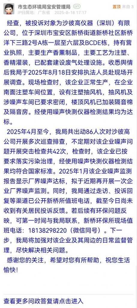 經(jīng)查,被投訴對象為沙彼高儀器(深圳)有限公司,位于深圳市寶安區(qū)新橋街道新橋社區(qū)新橋洋下三路2號A棟一層至六層及BCDE棟,持有營業(yè)執(zhí)照,主要生產(chǎn)香薰制品,主要工藝為注塑、香精灌裝,已配套建設(shè)廢氣處理設(shè)施。收悉輿情后我局于2025年8月18日安排執(zhí)法人員赴現(xiàn)場開展調(diào)查?,F(xiàn)場檢查時,該企業(yè)正常生產(chǎn),在企業(yè)南面注塑車間位置,設(shè)有注塑抽風(fēng)機(jī),抽風(fēng)機(jī)及涉噪聲車間已要求密閉,樓頂風(fēng)機(jī)已加裝隔音棉及隔音房。經(jīng)使用噪聲快測儀器檢測結(jié)果均為達(dá)標(biāo)。