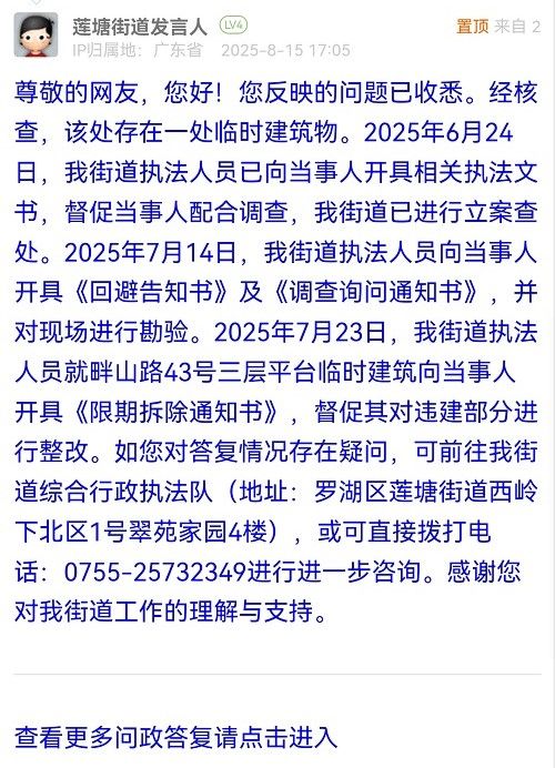 尊敬的網(wǎng)友,您好!您反映的問題已收悉。經(jīng)核查,該處存在一處臨時建筑物。2025年6月24日,我街道執(zhí)法人員已向當(dāng)事人開具相關(guān)執(zhí)法文書,督促當(dāng)事人配合調(diào)查,我街道已進(jìn)行立案查處。2025年7月14日,我街道執(zhí)法人員向當(dāng)事人開具《回避告知書》及《調(diào)查詢問通知書》,并對現(xiàn)場進(jìn)行勘驗(yàn)。2025年7月23日,我街道執(zhí)法人員就畔山路43號三層平臺臨時建筑向當(dāng)事人開具《限期拆除通知書》,督促其對違建部分進(jìn)行整改。如您對答復(fù)情況存在疑問,可前往我街道綜合行政執(zhí)法隊(duì)(地址:羅湖區(qū)蓮塘街道西嶺下北區(qū)1號翠苑家園4樓),或可直接撥打電話:0755-25732349進(jìn)行進(jìn)一步咨詢。感謝您對我街道工作的理解與支持。