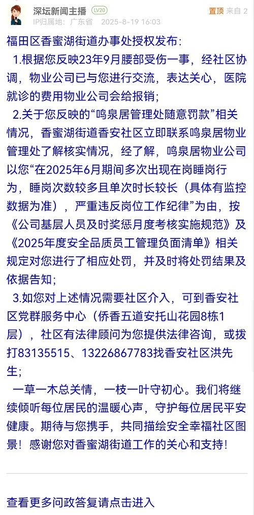 2.關(guān)于您反映的“鳴泉居管理處隨意罰款”相關(guān)情況,香蜜湖街道香安社區(qū)立即聯(lián)系鳴泉居物業(yè)管理處了解核實(shí)情況,經(jīng)了解,鳴泉居物業(yè)公司以您“在2025年6月期間多次出現(xiàn)在崗睡崗行為,睡崗次數(shù)較多且單次時長較長(具體有監(jiān)控數(shù)據(jù)為準(zhǔn)),嚴(yán)重違反崗位工作紀(jì)律”為由,按《公司基層人員及時獎懲月度考核實(shí)施規(guī)范》及《2025年度安全品質(zhì)員工管理負(fù)面清單》相關(guān)規(guī)定對您進(jìn)行了相應(yīng)處罰,并及時將處罰結(jié)果及依據(jù)告知;