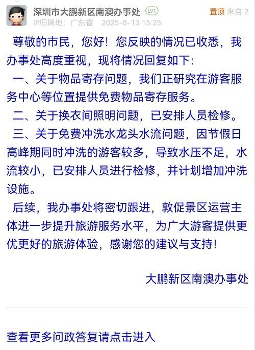 三、關(guān)于免費(fèi)沖洗水龍頭水流問題,因節(jié)假日高峰期同時沖洗的游客較多,導(dǎo)致水壓不足,水流較小,已安排人員進(jìn)行檢修,并計劃增加沖洗設(shè)施。