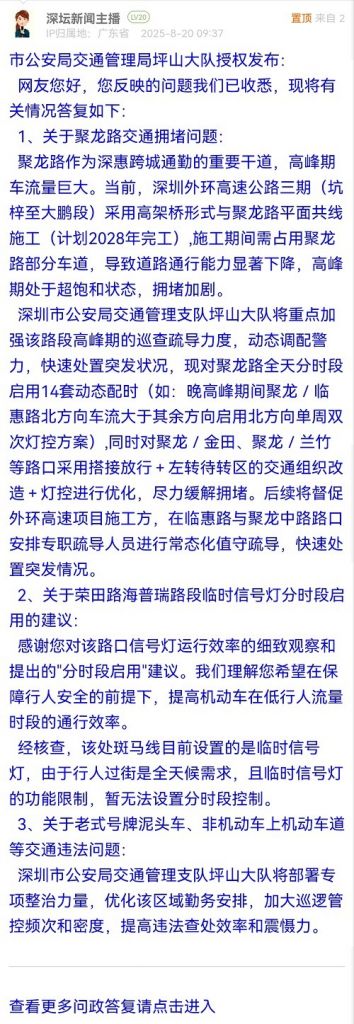 深圳市公安局交通管理支隊(duì)坪山大隊(duì)將重點(diǎn)加強(qiáng)該路段高峰期的巡查疏導(dǎo)力度,動態(tài)調(diào)配警力,快速處置突發(fā)狀況,現(xiàn)對聚龍路全天分時段啟用14套動態(tài)配時(如:晚高峰期間聚龍/臨惠路北方向車流大于其余方向啟用北方向單周雙次燈控方案),同時對聚龍/金田、聚龍/蘭竹等路口采用搭接放行+左轉(zhuǎn)待轉(zhuǎn)區(qū)的交通組織改造+燈控進(jìn)行優(yōu)化,盡力緩解擁堵。后續(xù)將督促外環(huán)高速項(xiàng)目施工方,在臨惠路與聚龍中路路口安排專職疏導(dǎo)人員進(jìn)行常態(tài)化值守疏導(dǎo),快速處置突發(fā)情況。