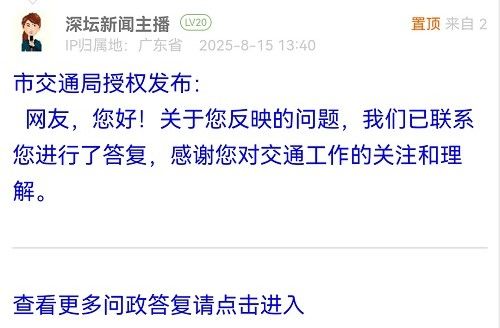 據(jù)統(tǒng)計,2025年8月11日-2025年8月17日,網(wǎng)友在深圳論壇發(fā)布問政類帖文共31篇,得到相關(guān)單位正式回應(yīng)的帖文數(shù)為31篇,本期簡報回應(yīng)速度最快的單位:市市場監(jiān)督管理局光明監(jiān)管局、福田交通局、龍華區(qū)民治街道辦事處、南山區(qū)南頭街道辦事處、市公安局交通管理局龍崗大隊(duì)、龍崗區(qū)衛(wèi)生健康局、南山區(qū)城市管理和綜合執(zhí)法局、福田區(qū)梅林街道辦事處、羅湖區(qū)蓮塘街道辦事處。