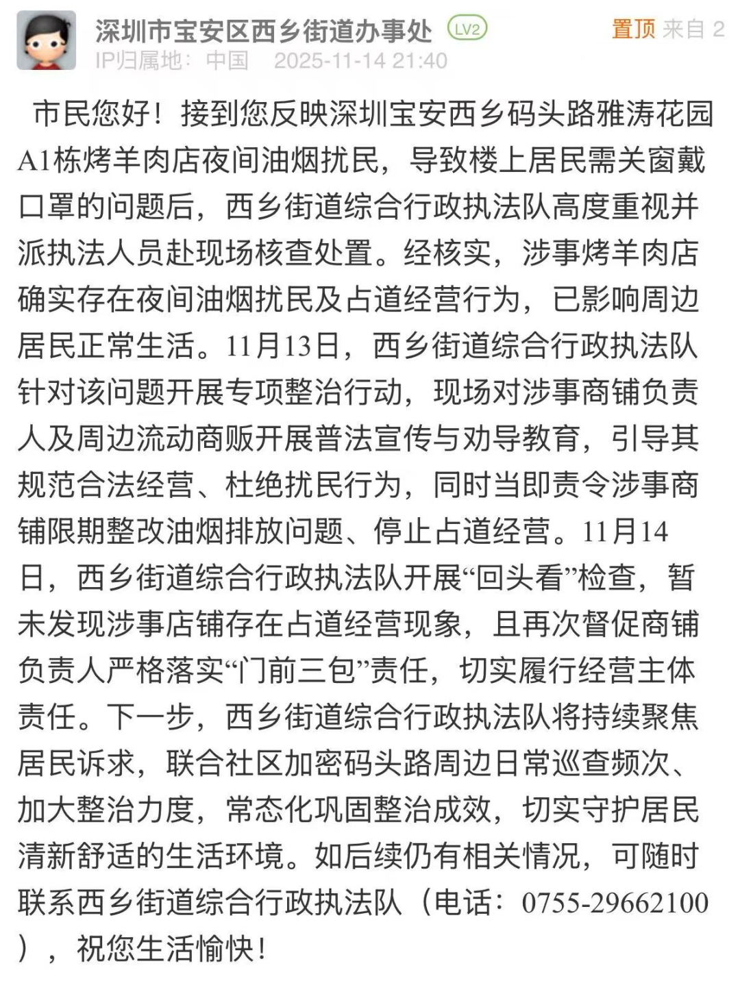 案例點(diǎn)評:接到市民反映后,街道迅速響應(yīng),當(dāng)日開展核查,次日回應(yīng)進(jìn)展,處置高效。針對涉事店鋪油煙問題,執(zhí)法隊(duì)不僅現(xiàn)場開展普法勸導(dǎo),責(zé)令商鋪限期整改,更在次日開展“回頭看”檢查,及時(shí)跟進(jìn)整改進(jìn)度、壓實(shí)經(jīng)營主體責(zé)任?;貞?yīng)中,街道明確下一步將聯(lián)合社區(qū)加密日常巡查、加大整治力度,常態(tài)化鞏固整治成效,體現(xiàn)出緊盯民生痛點(diǎn)、深耕基層精細(xì)化治理、全力守護(hù)居民舒適生活環(huán)境的決心。