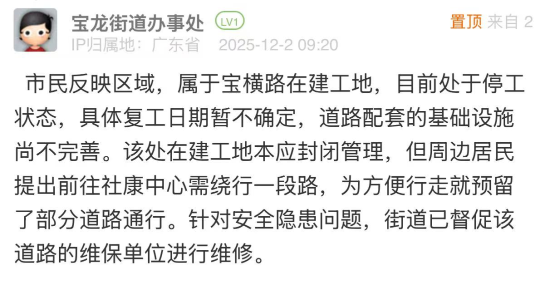 優(yōu)化建議:針對市民反映的道路在建工地預(yù)留道路路燈暗淡、路磚碎裂等問題,帖文回應(yīng)存在“解釋多、舉措少”的短板,未能化解群眾多次投訴無果的不滿。同時(shí),“復(fù)工日期暫不確定”的表述易引發(fā)市民的疑惑與不滿,后續(xù)有市民在評論區(qū)反饋該道路仍未啟動維修工作,建議責(zé)任單位主動協(xié)同項(xiàng)目建設(shè)、施工等責(zé)任主體,明確給出復(fù)工的預(yù)估時(shí)間或階段性處置方案及臨時(shí)性保障措施,推動問題解決。
