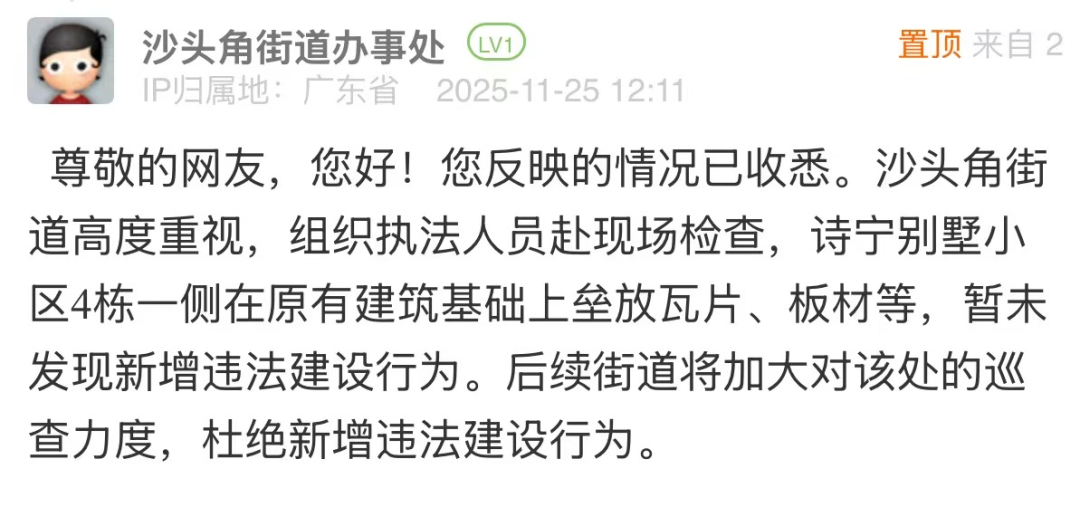針對網(wǎng)民投訴的小區(qū)違建問題,街道回應(yīng)僅以“未發(fā)現(xiàn)新增違法建設(shè)行為”簡單回復(fù),尚有完善空間。若該點(diǎn)位存在建設(shè)年代久遠(yuǎn)、權(quán)屬界定模糊、涉及多主體協(xié)調(diào)等客觀難點(diǎn),可適度說明,并在回應(yīng)中補(bǔ)充核查細(xì)節(jié),說明后續(xù)處置方向與階段計(jì)劃,讓回應(yīng)更具可信度和實(shí)操性,回應(yīng)市民對“依法履職”的期待。