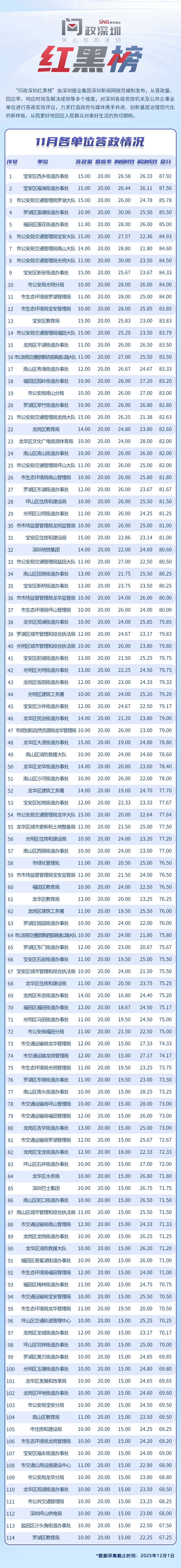 為探尋媒體如何精準(zhǔn)賦能基層治理現(xiàn)代化的“深圳路徑”,深圳報(bào)業(yè)集團(tuán)正式掛牌成立“問政深圳”工作室,旨在進(jìn)一步推動網(wǎng)絡(luò)問政工作的高效開展。為確保相關(guān)工作更加契合實(shí)際需求,深圳報(bào)業(yè)集團(tuán)深圳新聞網(wǎng)按照“最快速度辦結(jié)”的總體要求,將原有月度榜單創(chuàng)新升級為“問政深圳紅黑榜”,并對評分體系進(jìn)行了細(xì)致優(yōu)化。該榜單從答政量、回應(yīng)率、響應(yīng)時(shí)效及解決成效等多個(gè)維度,對深圳各級黨政機(jī)關(guān)及公共企事業(yè)單位進(jìn)行答政實(shí)效評議,力求打造政府與媒體攜手共進(jìn)、創(chuàng)新基層治理現(xiàn)代化的新樣板,從而更好地回應(yīng)人民群眾對美好生活的熱切期盼。