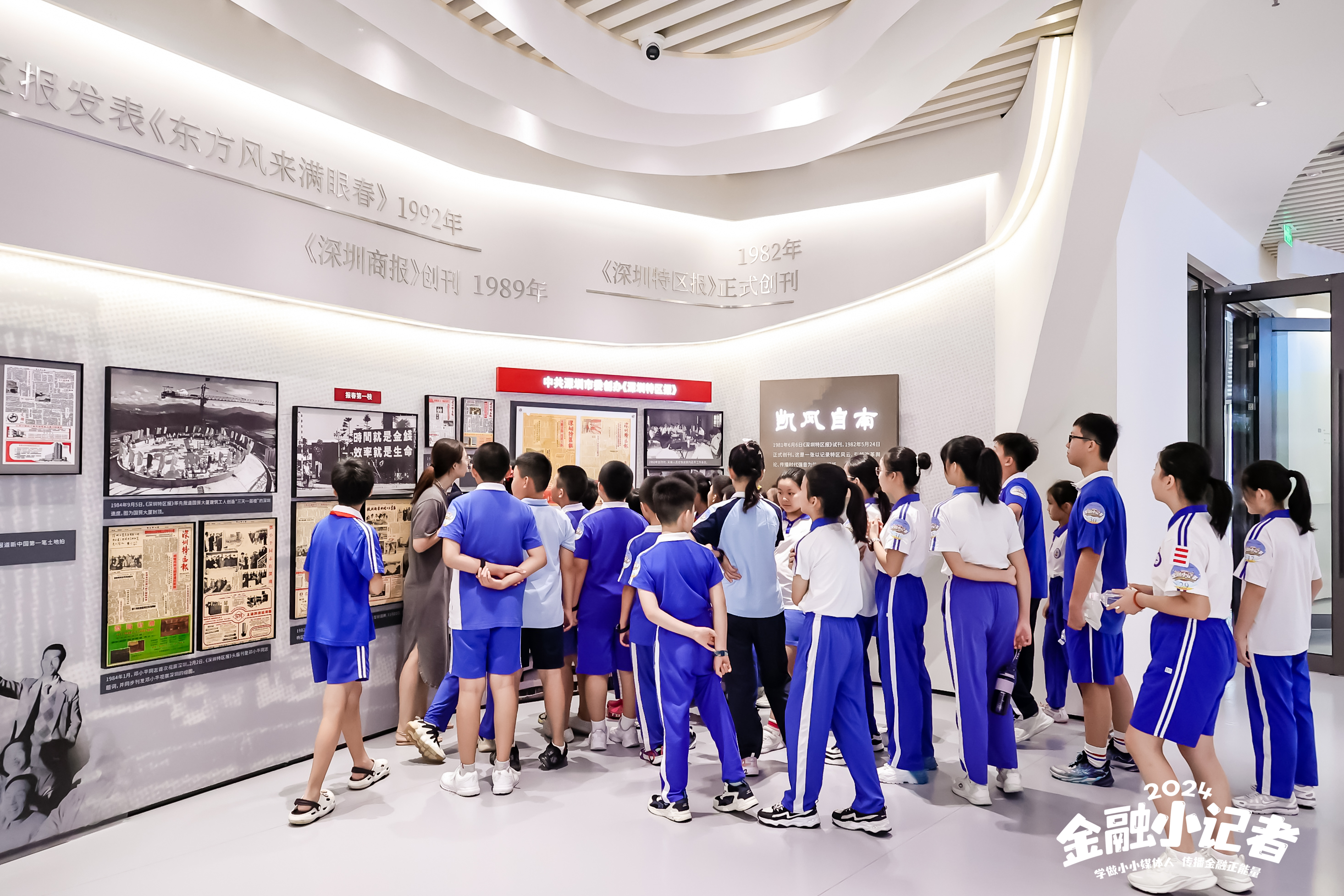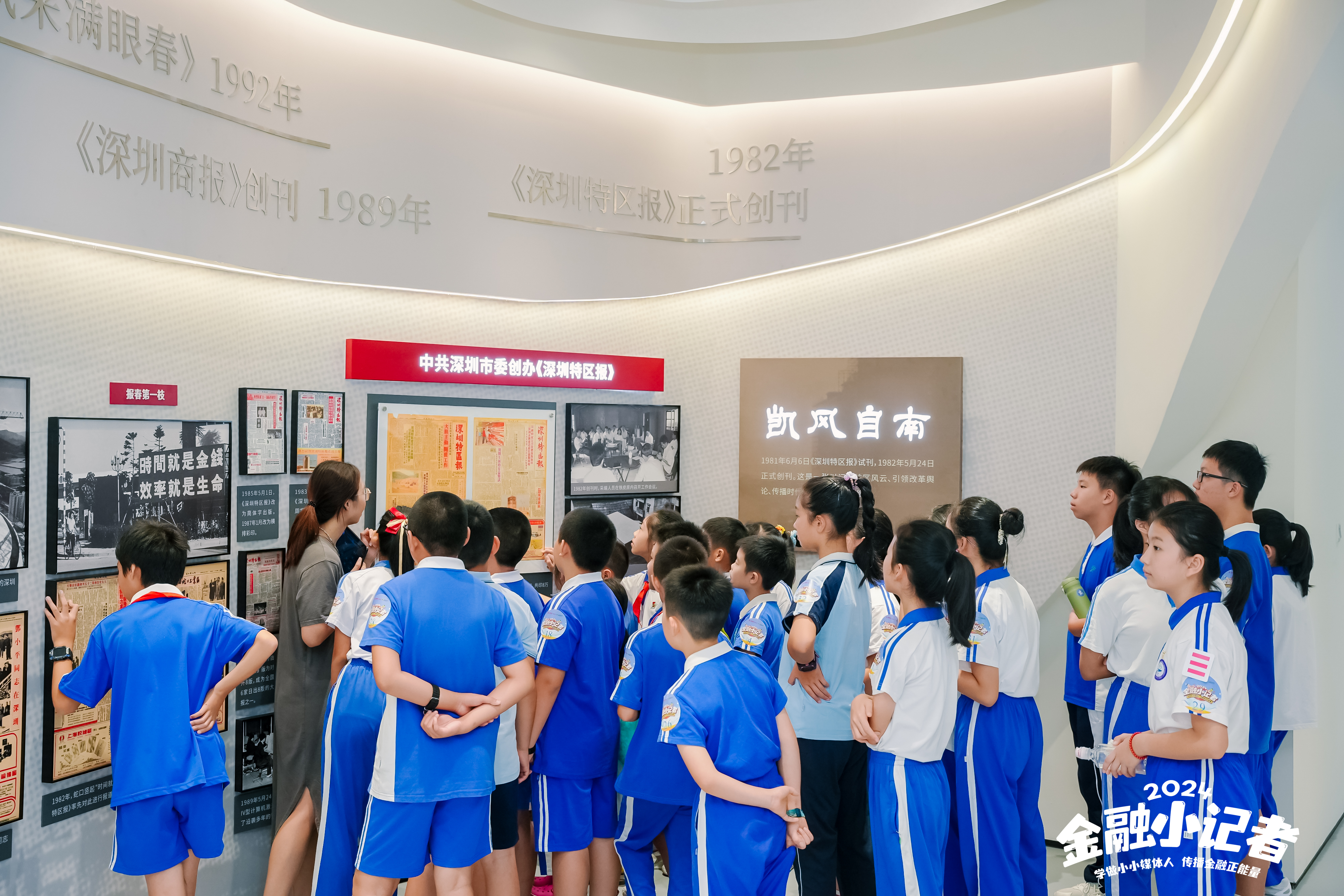 小記者們駐足觀看深圳報業(yè)成長史視頻